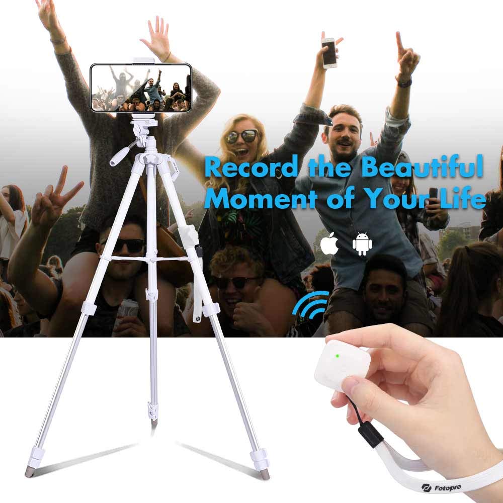 Features -This Camera Tripod Is Specially Designed For Entry-Level Shooting Lovers. -Compact, Lightweight, 3-Way Head And Quick Locking Legs System Make It Easy To Operate. -The 1/4 Screw In The Quick Release Plate Can Connected With Most Camera, The Max Loading Of This Tripod Is 2Kgs. It Can Also Work With Smartphone And Action Camera . -The Bluetooth Remote Control Can Be Used To Take Photos And Videos. -There Is A Bluetooth Remote Control In One Leg Of The Tripod For Putting The Remote. Product Specification Brand: Fotopro Model No: Basic-One Color: White Net Weight:0.68Kg (1.49Lbs) Sections: 4 Max Tube Diameter: 20Mm (0.78In) Max Height: 1540Mm (60.62In) Folded Height: 480Mm (18.89In) Min Height:490Mm (19.29In) Load Capacity: 2Kg (4.40Lbs) Bluetooth Version:3.0 The Max Remote Control Distance Can Up To 10 Meters Whats In The Box Tripod X 1 Ball Head With Quick Release Plate X 1 Bluetooth Remote Control X 1 Phone Adapter X 1 Action Camera Adapter X 1 Carrying Bag X 1
