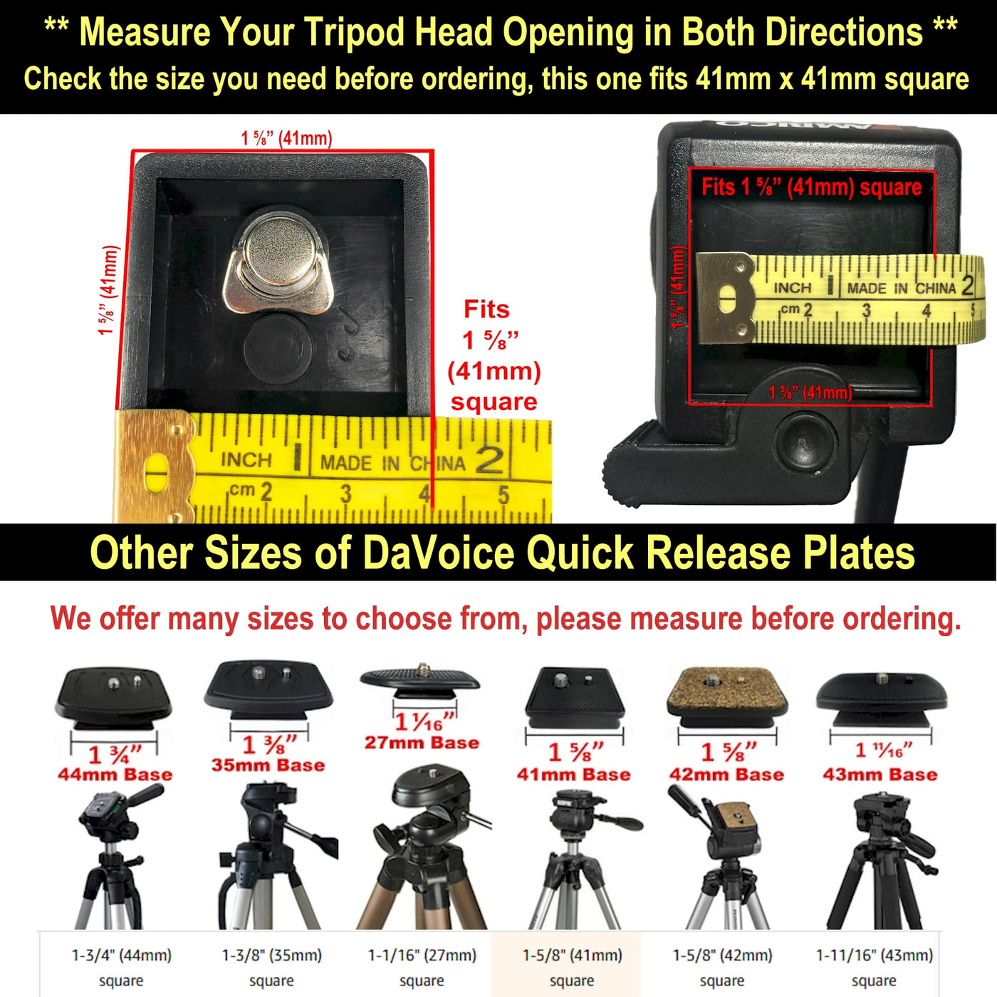 Tripod Quick Release Plate Replacement For: Ambico V-0550 V-0551 V-0552 V-0553 V-0554 Fluid Head Tripods Only, Sunpak 7500 Pro, Platinum Plus 7500Pg, Platinum Plus 7500 Pro, Ultra 7500Tm, Ultra 7575, Ultra 757, Ultra 757Tm, Platinum Plus 757, Ultra 757B, Platinum Plus Ultra 757B, 9500, 9502Tm, Qsx 9500, Qsx 9502 Tripods (Part Number 620-733), Older Sunpak Platinum Plus 5858D Tripods Only, Sunpak 6000Pg Tripod & 620-Cpg / 620Cpg Head Only, Samsonite 1100, 2600, 2601, 8801 And 8802 Tripods, Solidex Nextech Vt200 Compact Tripod, Quantaray Qsx 9500, Qsx 9502, Qsx9500, Qsx9502 Tripods, Kalimar Pro-Tech V-40 Tripod With V40 Photo/Video Fluid Type Head, Pro-Tech V-60 & V-80 Tripod With Fluid Type Head. Bottom Size: 1 5/8 X 1 5/8 (41Mm X 41Mm Square) Camera Tripod Mount Top Size: 41.4Mm X 45Mm Where The Camera Attaches To The Camera Quick Release Plate. Weight: 16G. No Coin Or Screwdriver Is Needed To Tighten The Screw On This Tripod Camera Mount Plate. The Tapered Square Base That Fits Into The Tripod Clip Mount Base Is 41Mm X 41Mm Bottom Dimensions That Fits Inside The Mount Tripod Replacement Head Of The Tripod Accessory Mounting Plate). 1/4 Inch Camera Mounting Screw Fits Most Cameras And Camcorders (And Cell Phone Tripod Adapter Mount, And Tripod Accessories). Tripod Top Plate Attaches To The Tripod Mount Adapter On Your Camera And Allow You To Quickly And Easily Attach And Detach Your Camera Tripod Parts And Mounts Or Device From A Compatible Tripod Head Plate. Having Extra Dslr Quick Release Plates Qr Plate Means You Can Quickly Swap Cameras Or Devices With The Same Tripod Head. Lets You Easily Remove Your Camera Or Device From Your Tripod Mounting Plate. Works As A Sunpak Camera Mount Tripod Attachment And Camera Plate Adapter. Includes 1 X Davoice Brand Quick Release Base Plate (41Mm) Tripod Connector For Camera. This Is A Davoice Brand Tripod Plate Quick Release. Any Use Of Other Brand Names Is Solely For Purposes Of Demonstrating Compatibility.