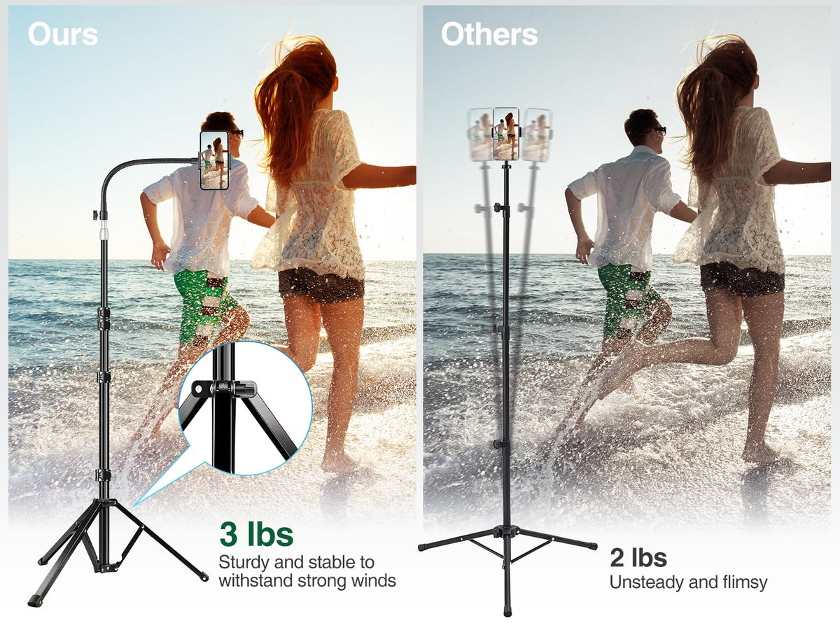 Q: How tall is the Elitehood phone tripod and what are its main features?A: This tripod can extend up to 80 inches in height, making it ideal for capturing shots from unique angles. Key features include a 15-inch flexible gooseneck, a patented 360-degree swivel tilt phone holder, and a durable design weighing only 3 pounds, allowing for easy transport and setup.