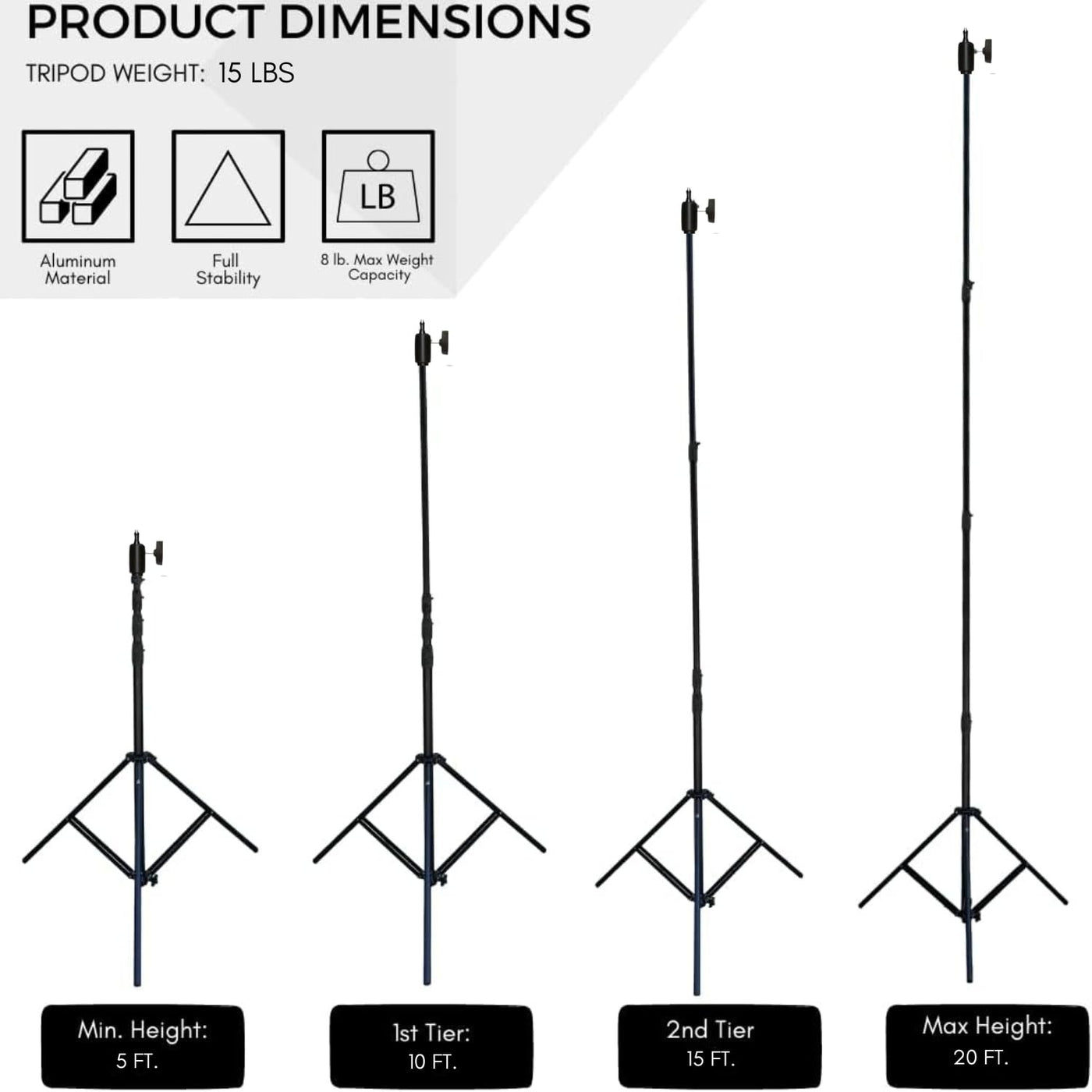 The Supplied Spigot Enables You To Mount Various Accessories On The Tst20. With The Addition Of An Optional Thread Adapter, A Ball Head Or Panoramic Head Can Be Mounted On The Stand. Further, The Solo Shot Is An Ideal Accessory To Use In Conjunction With The Tst20. Minimal Height: 171 Cm Maximal Height: 600 Cm Collapsed Length: 150 Cm Sections (Mm): 45 / 40 / 36 / 31 / 28 Suspension: Air Suspension Diameter Legs (Mm): 25 Mm Spread: 138 Cm Color: Black Weight: 5.1 Kg Maximum Load Weight: 4 Kg Diameter Screw Thread: 1/4 Aluminum Construction For Lightweight Design And Transport 20 Ft Tall Aluminum Tripod Mast 5X 4Ft Air Cushioned Telescoping Sections Light And 1/4 Mounting Options Recommended Payload Up To 8 Lbs