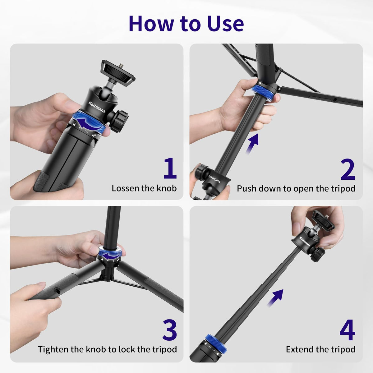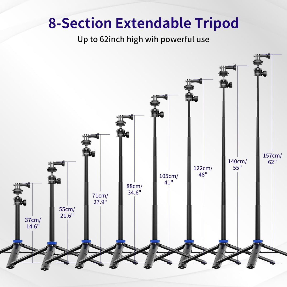 Kaitezenz Selfie Stick Tripod For Camera Gopro, 62'' Extendable Tripod Stand With 360 Ball Head 1/4'' Screw, Portable Lightweight Camera Tripod For Gopro Max Hero 11 10 9 8 7 6 5 Dji Osmo Action Camera Compatible For Gopro Hero 11 10 Tripod Selfie Stick Accessories Insta360 X3 Tripod Invisible Self Stick Tripod Tall Handle Osmo Extension Rod Built Pole Stand Black Portable Extendable Action Camera Tripods Kit Handle Mounts Adapter For Dji 62Inch ??62Inch Camera Tripod For Gopro?8 Sections Retractable Height Adjustment Up To 62In.Kt-1004 Selfie Stick Tripod, From 32.5Cm/12.7 Into 157Cm/62In, Extremely Silky Smooth To Stretch, Strong Support When Extended In 8 Lengths, Can Meet All Your Shooting Needs. ??Comes With Gopro Adapter?The 3-In-1 Tripod Can Be Used Not Only As A Camera Tripod But Also As A Handheld Grip Or Selfie Stick. Kaitezenz Gopro Tripod Includes A Gopro Adapter For All Gopro, Dji Action, And Other Action Cameras. The Universal 1/4'' Screw On The Top Of The Camera Tripod Fits All Insta360 Cameras And Sony Canon Nikon Compact Cameras. ??360 Panoramic Ball Head?Our Gopro Camera Tripod Is Designed With A 360-Degree Rotatable Universal Ball Head For Horizontal And Vertical Shooting, Which Can Be Adjusted To A Variety Of Shooting Angles, Allowing You To Capture The Perfect Shot. Simply Tighten The Adjustment Knob On The Ball Head To Lock A Fixed Angle. ??Super Stable Tripod Mode?The Selfie Stick Tripod For The Camera Gopro Comes With A Tripod Lock, Which Is Designed From Aluminum Alloy To Provide Strong Support In Tripod Mode. You Can Adjust Different Heights To Keep The Center Column Away From The Ground And Stand Firmly On Most Uneven Surfaces. ??Premium Construction Design?The Selfie Stick Tripod For Gopro Camera Is Made Of High-Quality Abs Material, Stable Structure, Lightweight And Durable; Weighing Only 0.77Lb/350G, You Can Easily Put It Into Your Backpack. Perfect For Outdoor Activities, Such As Taking Photos, Selfies, Videograp