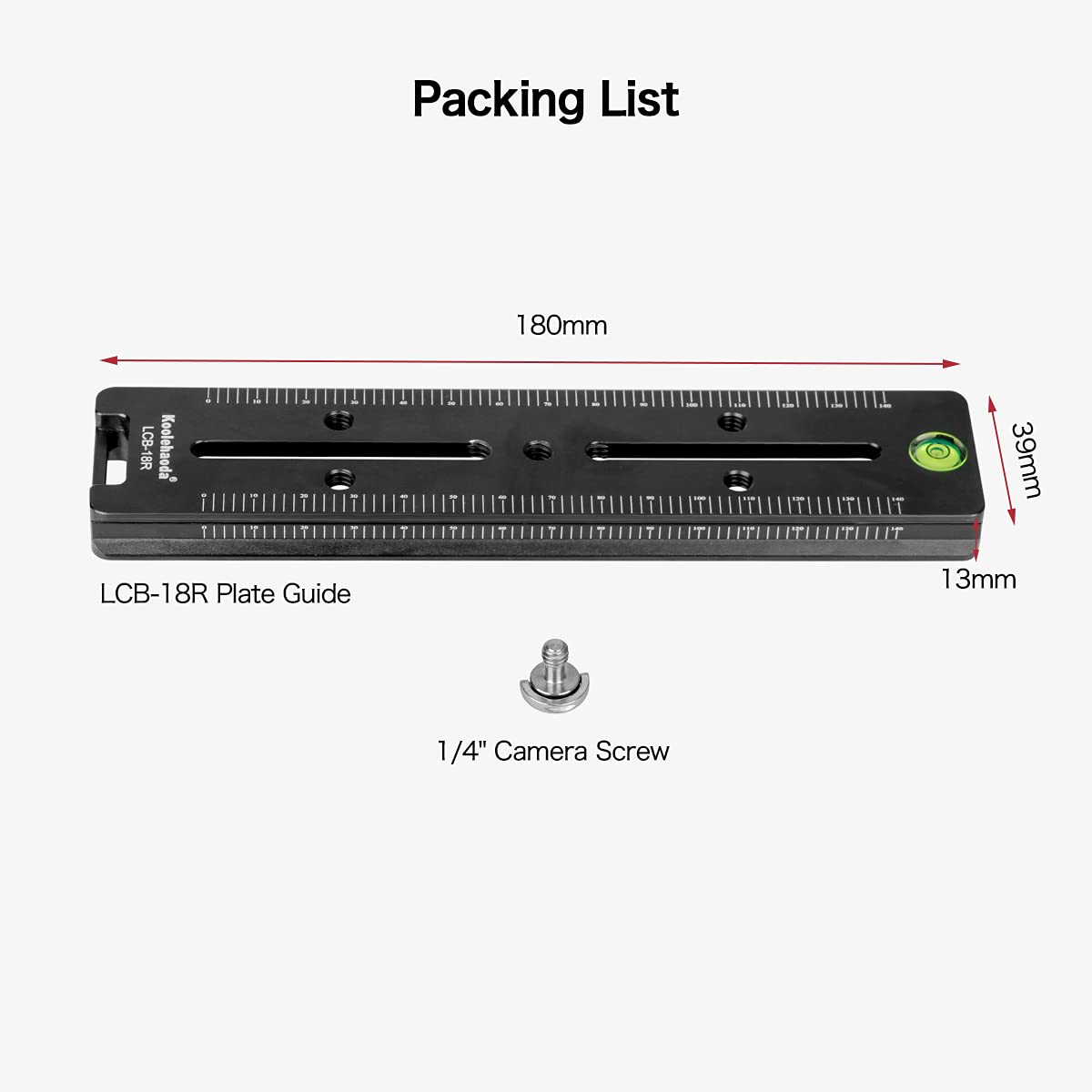 Q: What is included in the package when purchasing the Quick Release Plate?A: When you purchase the koolehaoda 180mm Quick Release Plate, the package includes one LCB-18 Quick Release Plate and one 1/4" screw, providing everything needed for immediate installation and use.
