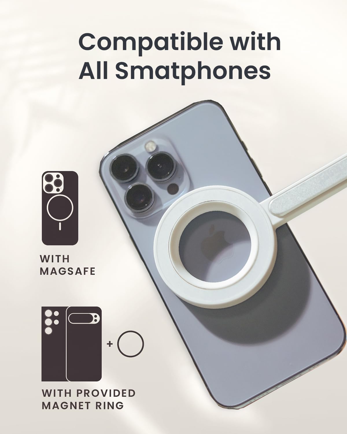 Q: Can I use this tripod with Android phones?A: Yes, the tripod is designed for universal compatibility. For Android phones and non-MagSafe cases, the included metal rings ensure a secure attachment.