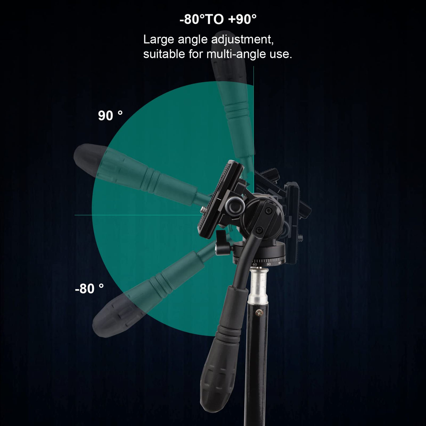 Q: What are the tilt and swivel angles for this tripod head?A: This tripod head can tilt at +90°/-80° and swivel 360°, providing flexibility for capturing multi-angle shots and smooth footage during video recording.