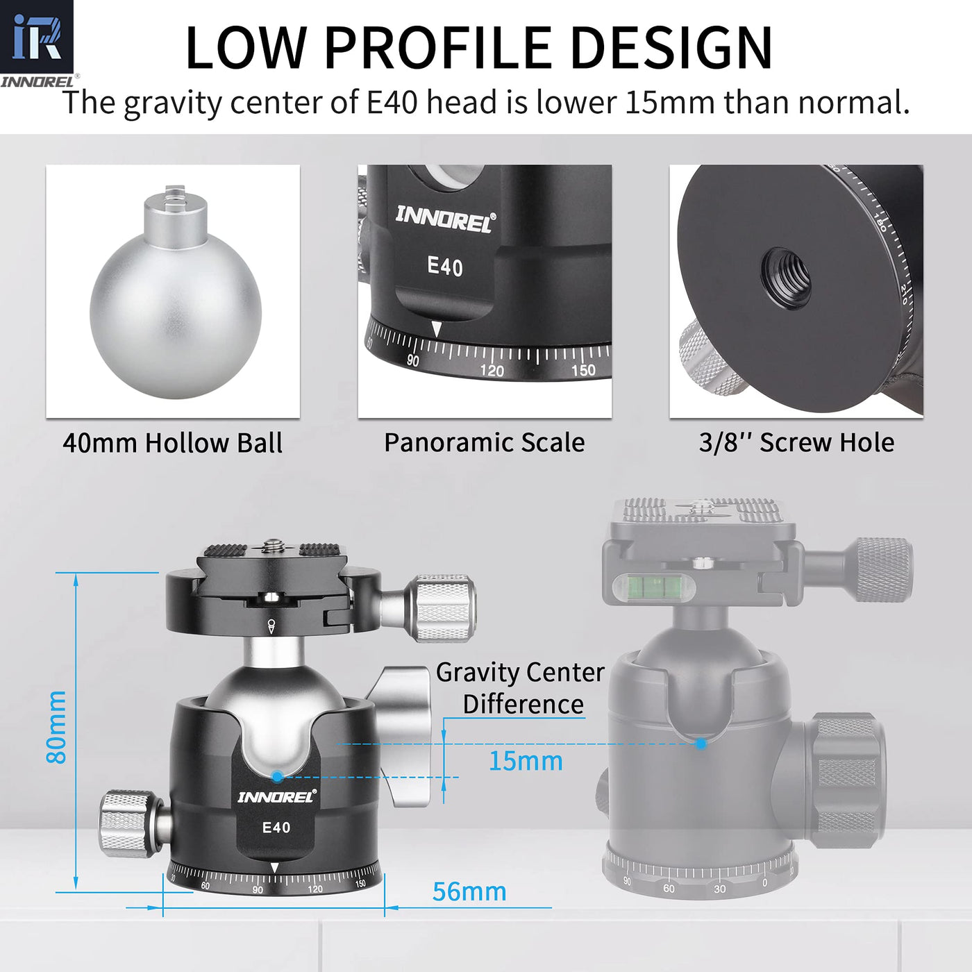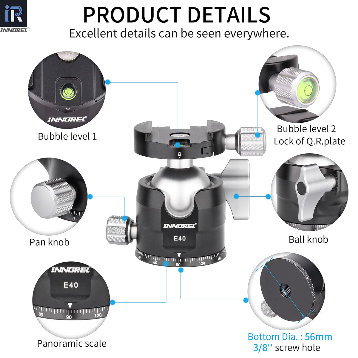 Specifications Brand: Innorel Model: E40 Max Load: 20Kg Net Weight: 0.36Kg Material: Aluminum Alloy Ball Diameter: 40Mm Bottom Diameter: 56Mm Height: 80Mm (Without Quick Release Plate) Quick Release Plate Size: 55*38*10Mm Descriptions 1. Low Gravity Center: In Response To The Requirements Of Customers, The Center Of Gravity Of E40 Is About 15Mm Lower Than Normal, With Better Stability And Good Locking Force. The Diameter Of The Ball Is 40Mm And Its Size Is Stable. The Fast Overspeed Rate Has A Safety Locking Mechanism, Which Can Prevent The Camera Equipment From Falling Down Accidentally When Adjusting The Fast Forward. 2. U-Slot And 360Panorama: With 360 Degree Rotating Dial, It Can Achieve Large Viewing Angle Even Without Wide Angle Lens, Which Is More Suitable For Panoramic Shooting. The Pan Below Has Scales And Arrows. The Horizontal Panorama Is Used To Capture Overlapping Images, And The Simple Calibration Accuracy Is Used For 360 Rolling Movement (Indoor, Building, Space, Starry Sky Are The Most Suitable). 3. Anti-Lost Design: All The Knobs Of This Ball Head Can Not Be Screwed Off. 4. Widely Applicable: It Can Fit Most Shooting Equipments (Camera Mounting Screw Is 1/4, Tripod Mounting Screw Is 3/8). For Objects: Smartphone, Mirror Mirror, Telephoto Lens, Digital Slr Camera, Dv, Tripod And Arca Swiss Standard Compatible, Including Fujifilm, Kodak, Etc.