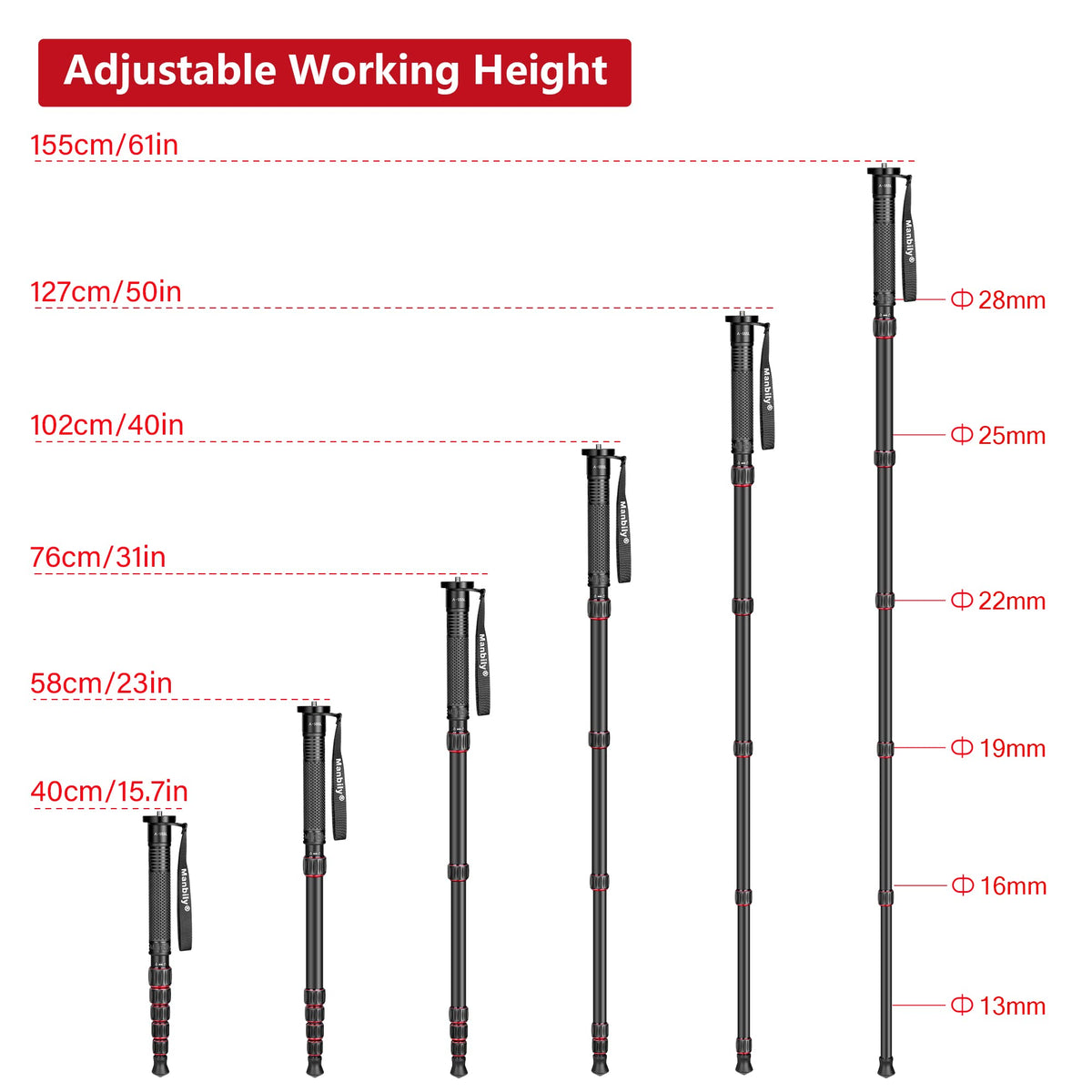Model: Manbily A-555L Material: Aluminum Product Weight: 1.1 Lb/0.49Kg Maximum Load Capacity: 15.4 Lb/7Kg Maximum Height: 61In/155Cm Folded Height : 15.7 Inches/40Cm Number Of Leg Sections: 6 Sections Locking Type: Twist Lock Maximum Tube Diameter: 28Mm Minimum Tube Diameter: 13Mm Mounting Thread: Reversible 1/4 '' & 3/8 '' Screw In The Box: 1 X Monopod 1 X Carry Bag 1 X Handle 1 X Allen Key 1 X Manual