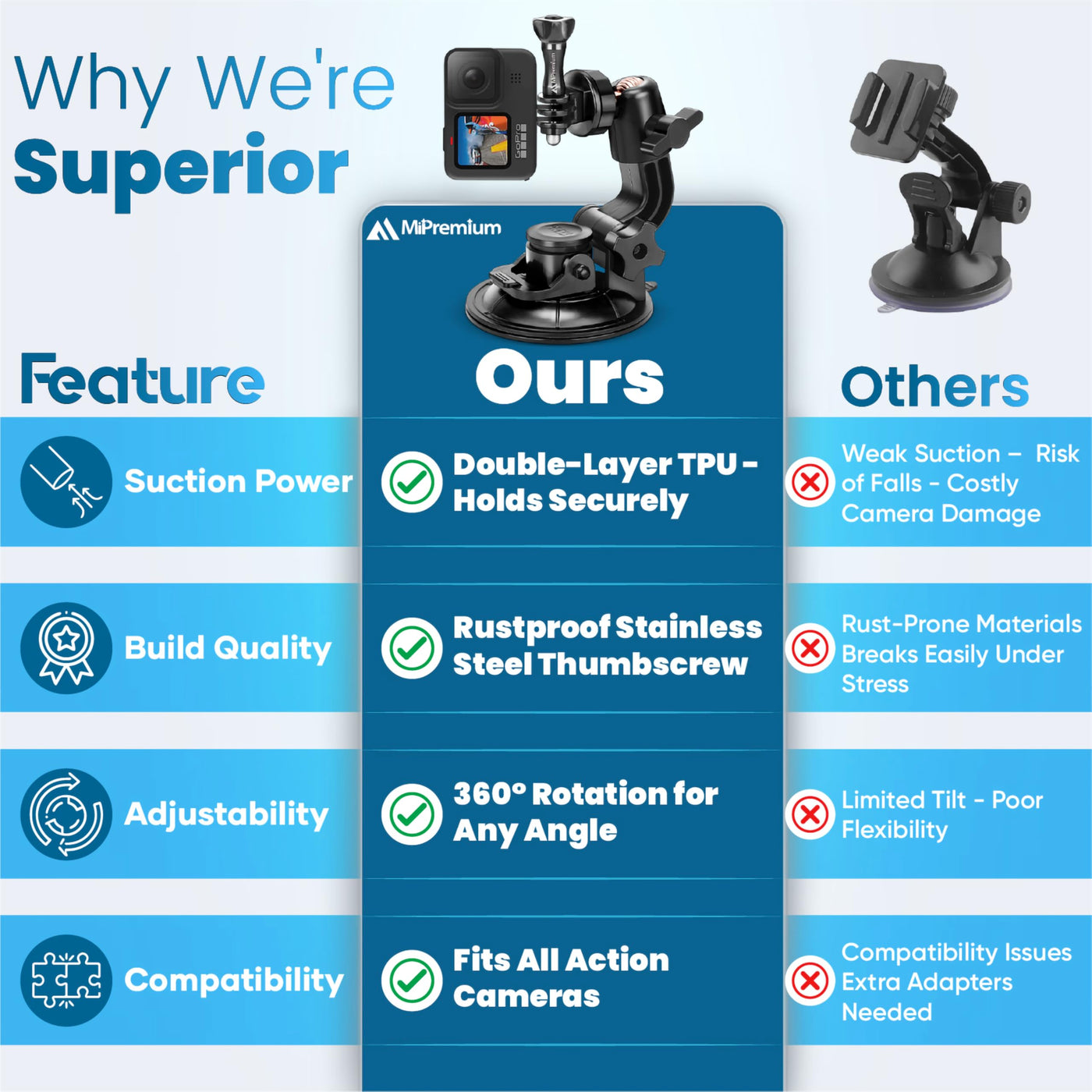 Use Mipremium Car Windshield Suction Cup Mount, The Premiere Brand Of Accessories Compatible With Go Pro Cameras. Bring Safety To Your Gopro Camera And Enjoy Recording The Best Moments You Capture On Your Thrilling Car Or Boat Rides. The Suction Cup Action Cam Holder Is Used As A Camera Stabilizer To Stabilize Your Footage, Keeps Your Image Steady And Will Keep Your Gopro Safe And Secure; Allowing You To Capture Those Great Moments With Handsfree. Whether You Want To Use On Your Car Windscreen, Dashboard, Window, Glas, Bonnet Or Any Other Smooth Surface, Mipremium Suction Cup Stand Is The Best Choice Of Mount For You. Here Is Why: ?Great Design -. Our Suction Cup Mount Comes With A Tripod Mount Which Can Accommodate Any Gopro Without The Need For Other Mounting Accessories, And Offers 360 Degrees Rotation And 180 Degrees Of Tilt To Help You Get The Perfect Angle. ?Solid Build & Wide Range Compatibility - Made Of Durable Abs+Pc Material And Metal Ball Joint, Packaged With Premium Quality Waterproof And Rustproof Thumbscrew, Built For Indoor And Outdoor Use In Any Environments & Weather Conditions! Compatible With Any Gopro Hd Black & Silver Session Hero13 Hero12 Hero11 Hero10 Hero9 Hero8, Hero7 Hero6, Hero5 Hero4S, Hero4, Hero3+, Hero3, Hero2, Hero1 And Other Gopro-Like Action Cameras, Such As; Dji Osmo Akaso Sjcam Sj7000 Sj6000 Sj6000 Sj4000 Sj6000 Xiaoyi Yi Ii 4K Apeman And Other.?Compact And Portable: A Highly Portable, Pocketsize Suction Cup Mount, Easy To Take Around.?Great Value - Package Content: 1 X Mipremium Suction Cup Mount Extra Value Added1 X Stainless Steal Rust Proof Thumbscrews 1 X Tripod Mount Note: The Cameras & Other Items In The Images Are Not Included In The Bundle.