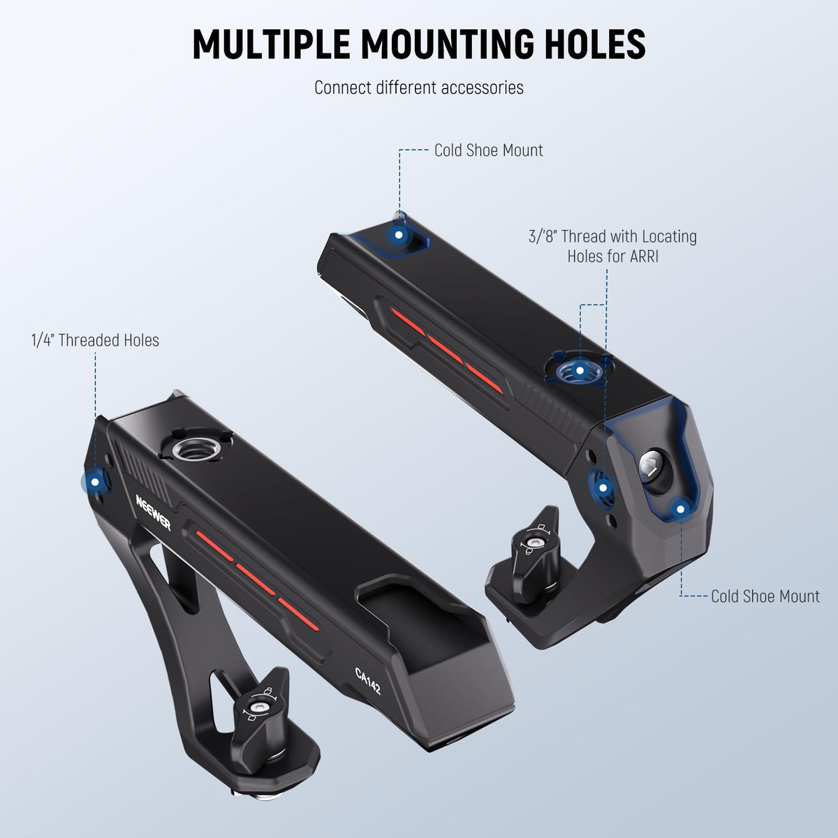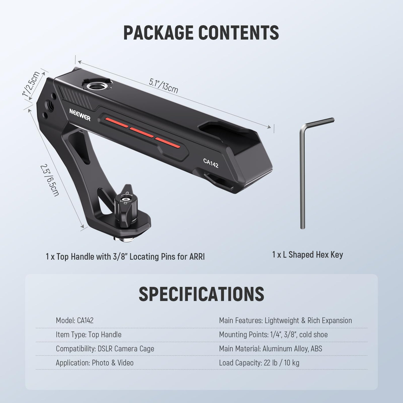 ?Introducing Neewer Basic? Simple And Practical, Neewer Basic Is An Economical Product Line That Focuses On Essential Functions And Designs, Without Unnecessary Extras And Materials | ?Top Handle With 3/8 Locating Pin For Arri? The Top Handle Attaches Securely To The Camera Cage Via A 3/8 Locating Pin For Arri, Offering Excellent Stability During Handheld Shooting, With The Adjustable Angles For Optimized Viewing Angles, Ensuring Sharp Footage And Improved Shooting Performance, Ideal For Outdoor Filming, Studio Work, And Travel Photography, And Essential And Must Have For Content Creators And Influencers. Max Load 22 Lb / 10 Kg | ?Lightweight & High Strength? Made From Aluminum Alloy And Abs, The Camera Top Handle Combines Lightweight Design With Exceptional Strength And Durability, Ensuring Reliable Performance Under Demanding Shooting Environments, Especially In Low Temperature Conditions, While Reducing The Overall Equipment Load. Plus, The Ergonomic Design Provides A Comfortable Grip During Extended Use | ?Easy To Set Up & Quick Release? Featuring Several 3/8 Locating Interfaces For Arri, The Camera Cage Handle Allows For Quick Installation And Removal, Enabling Photographers To Easily Connect Or Switch To Other Equipment. This Design Enhances Workflow Efficiency, Making It An Ideal Choice For Dynamic Shooting Scenarios | ?Multiple Expansion Options? With Two Cold Shoe Mounts, Several 3/8 Locating Holes For Arri, And A 1/4 Locating Hole, The Digital Camera Handle Grip Allows For The Attachment Of Photography Accessories And Gear Like Pan And Tilt Heads, Lightweight Microphones, Or Led Fill Lights, Providing Greater Flexibility And Completing Your Photography Rigs