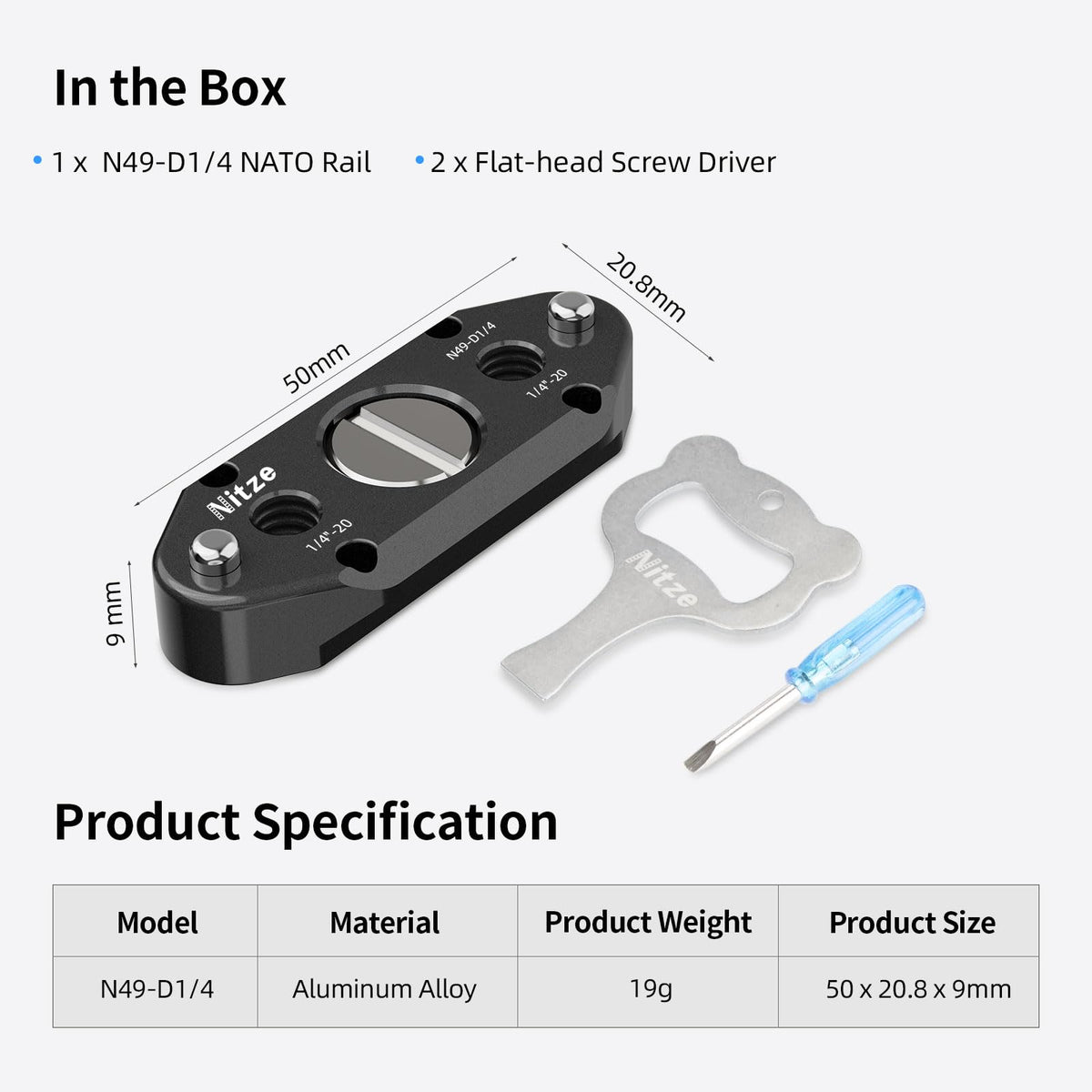 Q: What are the dimensions of the Nitze N49-D1/4 NATO rail?A: The Nitze N49-D1/4 NATO rail measures 50 mm (2 inches) in length and has a thickness of 9 mm (0.4 inches). This compact size makes it easy to integrate into various setups without adding excessive bulk.