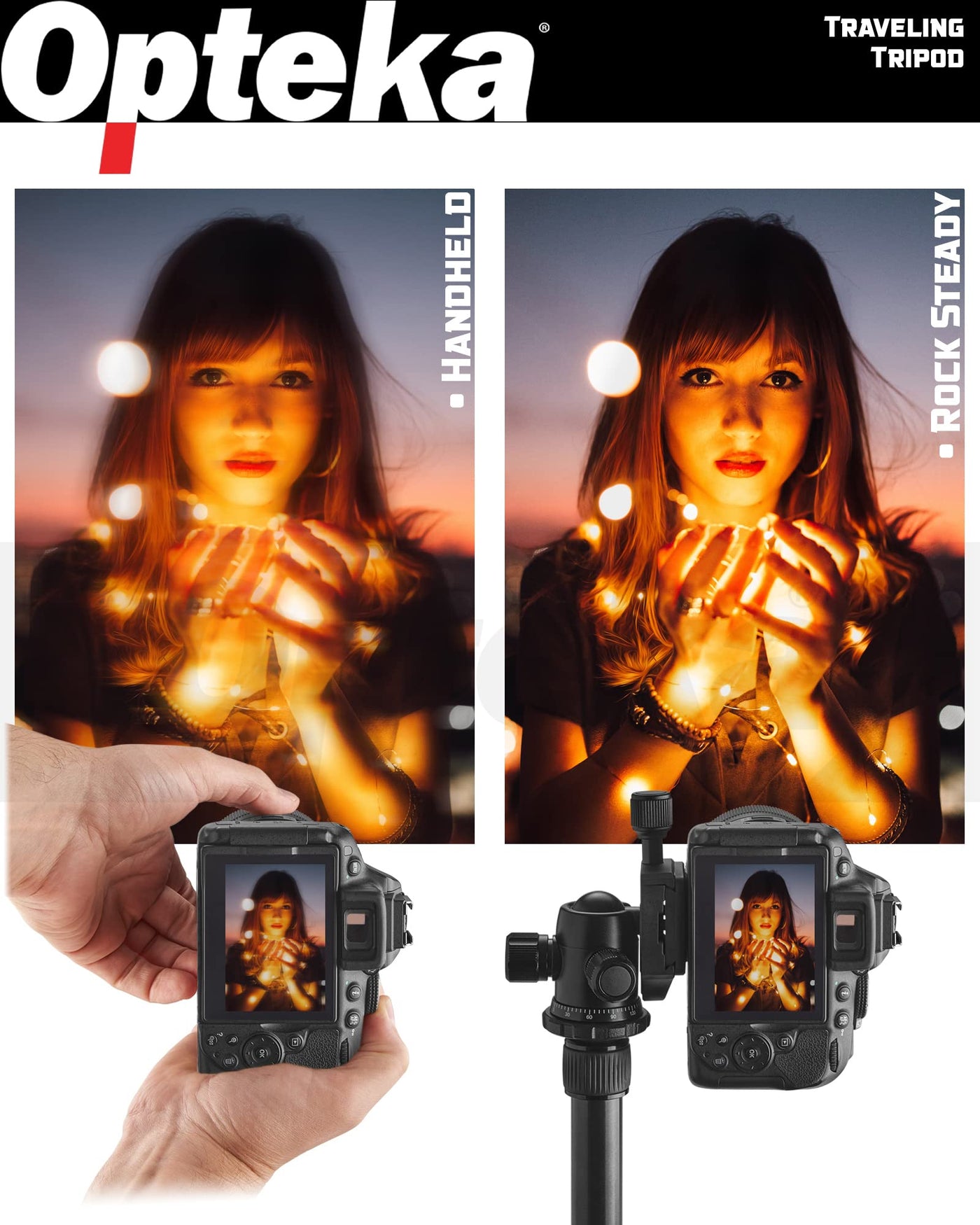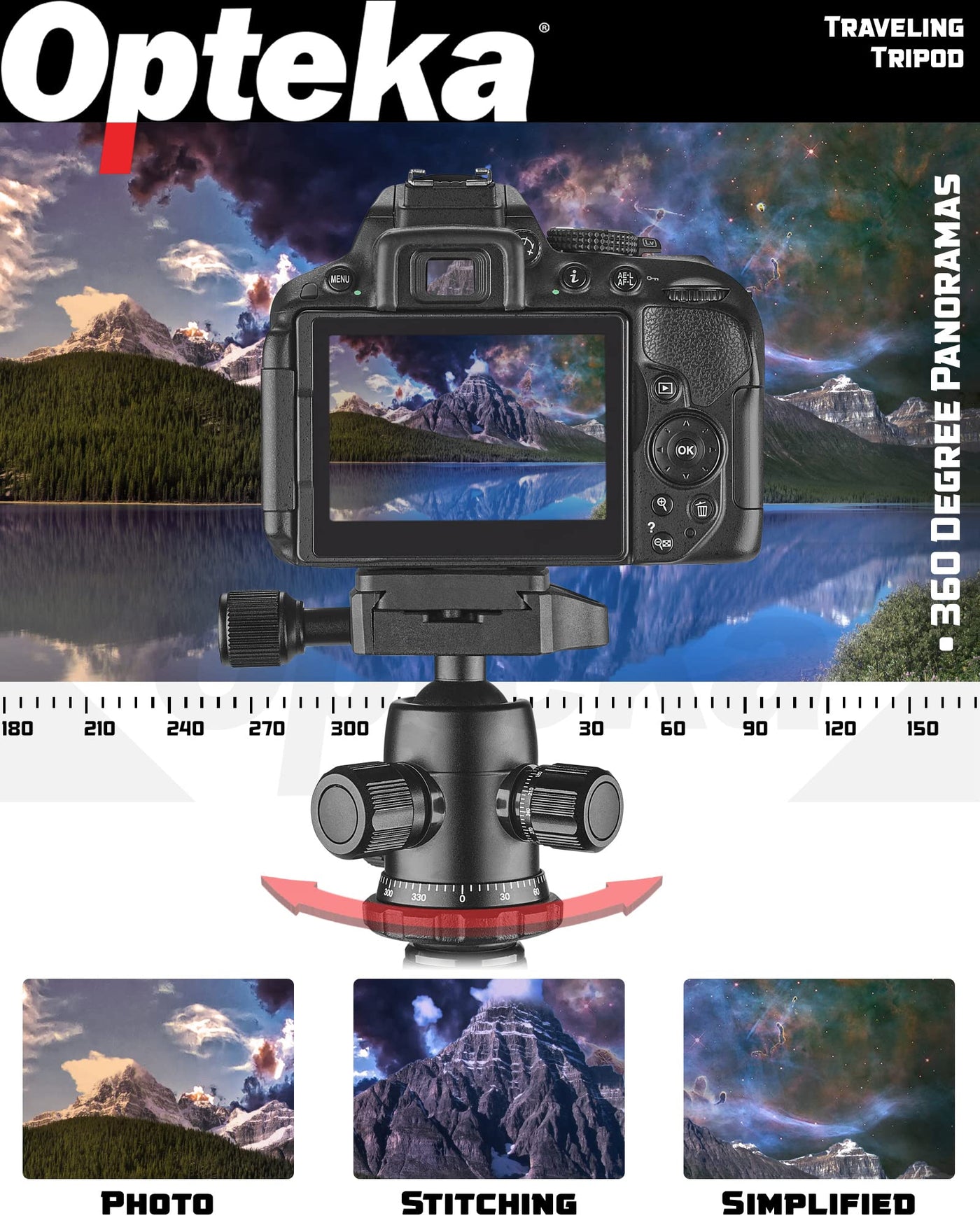 The Opteka 2-In-1 Tripod / Monopod Can Be Used As A Standard Tripod Or As A Monopod. It Has A Metal Ball Head For Ultra-Smooth And Fluid 360 Degree Panning With Independent Head And Pan Locks. Crafted From Durable, Corrosion Resistant, Lightweight Aluminum Magnesium Alloy, So Its Great For Heavy Use And Hectic Outdoor Shoots In Extreme Weather Conditions. It Comes With A Carry Case And Has A Spring-Loaded Bag Hook (So That The Included Case Can Act As A Counterweight In Windy Conditions). This Amazingly Versatile Opteka Tripod / Monopod Has A Reversible Center Post Which Allows You To Mount Your Camera Below The Tripod For Ground-Level / Low-Level Shooting And Macro Shooting Techniques, Allowing You To Shoot Subjects From A Unique Ground Level View, And For Capturing Intense Ultra-Wide-Angle Scenic Landscapes With Lots Of Foreground. The Combined Features Of The Heads Fluid 360 Panning, Tilt And Pan Locks And Bubble Level Allows You To Create Stunning 360-Degree Panoramas. Features Aluminum Magnesium Alloy Construction For Superior Durability And Corrosion Resistance Removable Metal Ball Head With Independent Pan And Tilt Locks Bubble Level For Perfectly Straight Horizons 360 Smooth And Fluid Panning Five Leg Sections With Twist Locks For Fast Height Adjustments Four Rubber Non-Slip Pads On The Release Plate Protects Your Devices Bottom Plate Four Rubber Non-Slip Caps On The Legs Protects Indoor Floors And Surfaces Universal 1/4 Tripod Thread Two Column Sections With Innovative Reversible Column For Low Angle And Macro Shooting Convenient Carry Case Included Specifications Maximum Height: 59 As A Tripod And 62 As A Monopod Minimum Height: 16 As A Tripod And 26 As A Monopod Collapsed Length: 15 Head: Metal Ball Head With Quick Release Plate Leg Sections: 5 With Twist Locks Material: Aluminum Magnesium Alloy Maximum Load: 22 Lbs Net Weight: 3.08 Lbs