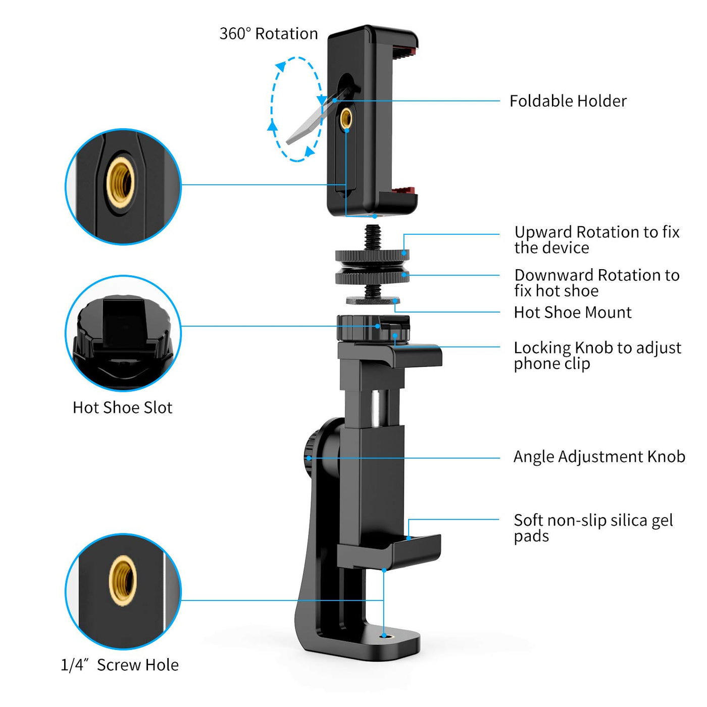 Make Your Cell Phone Photography Stand Out Get The Best And Latest Owine Phone Tripod Mount To Meet Various Needs Of Professional Smartphone Photography And Videography So You Concentrate On Making The Best Content Why Our Owine Mobile Phone Tripod Mount Can Meet All Your Professional Needs Multiple Connection Ways --- Our Perfect Phone Holder Not Only Has Its Own Hot Shoe Slot But Also Comes With A 14A Standard Screw And Two 14A Screw Hole At The Bottom Of Phone Clip And Stand Widely Fit For All Filming Device That Has 14A Screw Mount And Hot Shoe Mount 360A Rotation Adjustable --- 360 Degree Rotation Design To Support Shooting From Various Angles You Want, Portrait(Vertically), Landscape(Horizontally), Diagonal, Or Whatever Universal For Most Smartphones --- Mobile Phone Clip Size Is 58-105Mm(23-41 Inch) Width, Fits For All Smartphones Under 65 Screen, Such As Iphone 1111 Pro11 Pro Maxxxsxrxs Max8766S Plusse5S55C, Samsung Galaxy S1010+S9S9+S8S8+S7S6S6 Edge, Note1010+98 And Many Other Brands And Models And The Phone Tripod Holder Can Be Easily Adjusted To Hold Or Release The Phone Install 2 Cell Phones At Once --- Extra Bonus Of Cell Phone Holder Clamp Can Be Used For The Dual Connection Of A Tripod, Allowing You To Photograph With 2 Mobile Phones Together The Phone Clamp Also Can Be Used As A Table Base Steady & Protective --- Our Owine Phone Tripod Adapter Is Made Of Premium Quality Aluminum Alloy, Plastic And Soft Non-Slipping Silica Gel Pads Hold Any Smartphone Steady, No Sliding, No Shaking, No Damaging And No Scratch Specification: Material: Premium Quality Plastic Adjustable Clip Size: 58Mm-105Mm (23A-41A) Interface: International Standard Screw 14 Package Includes: 1 X Phone Tripod Mount With Hot Shoe Slot 1 X 14 Standard Screw Connector 1 X Phone Holder Clamp