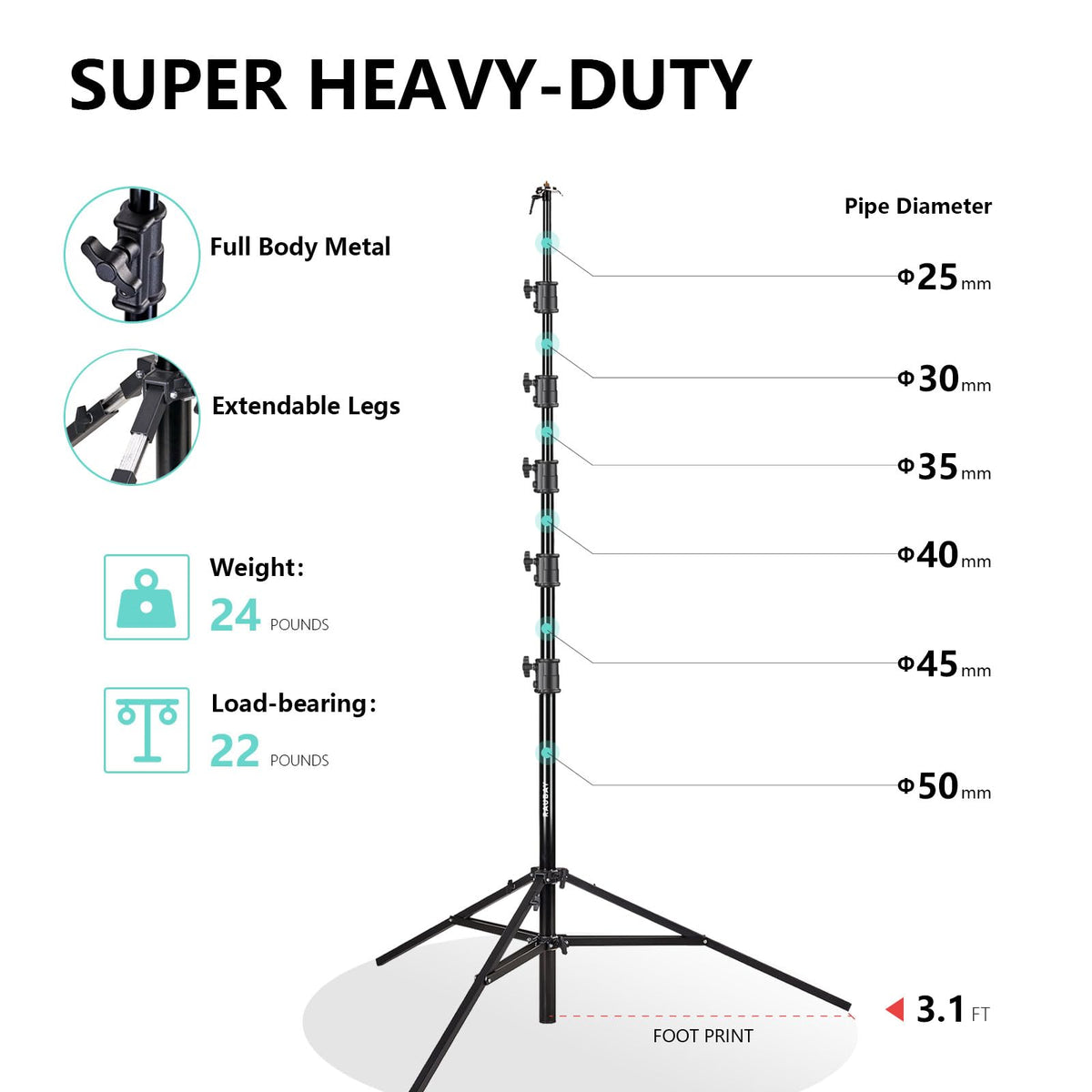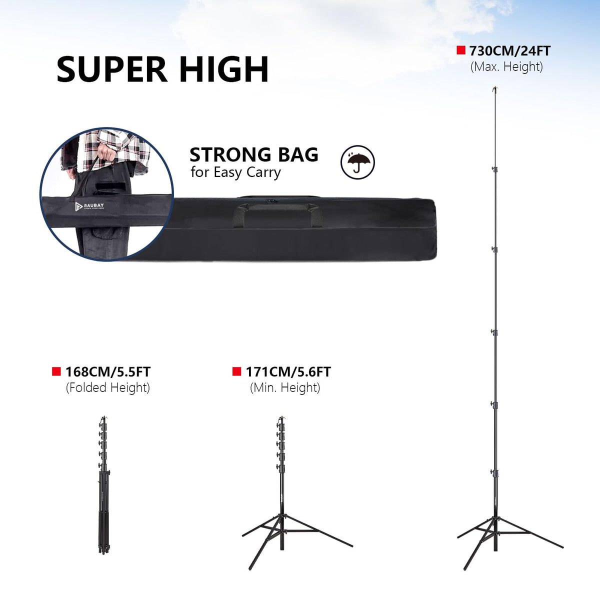 Q: What is the maximum height of the RAUBAY tripod?A: The RAUBAY tripod stands at an impressive height of up to 24 feet, making it ideal for capturing overhead shots in various situations.