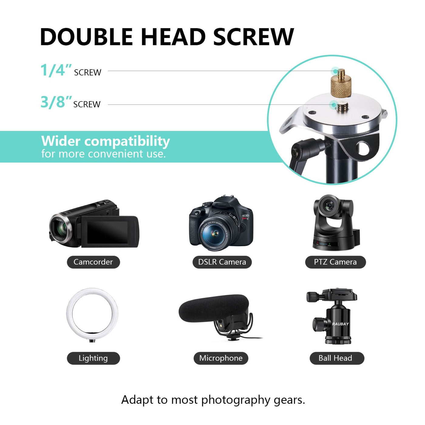 Q: Is the RAUBAY tripod compatible with all camera types?A: Yes, the RAUBAY tripod features both 1/4" and 3/8" screw adapters, ensuring compatibility with most cameras available in the market.