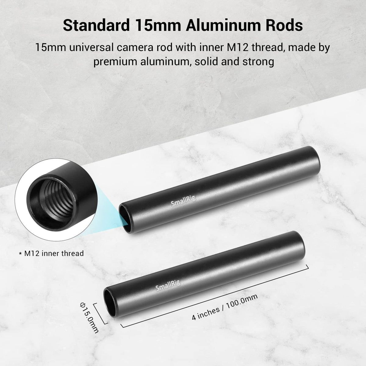Smallrig 4 Inches (10 Cm) Black Aluminum Alloy 15Mm Rod With M12 Female Thread, Pack Of 2 1049