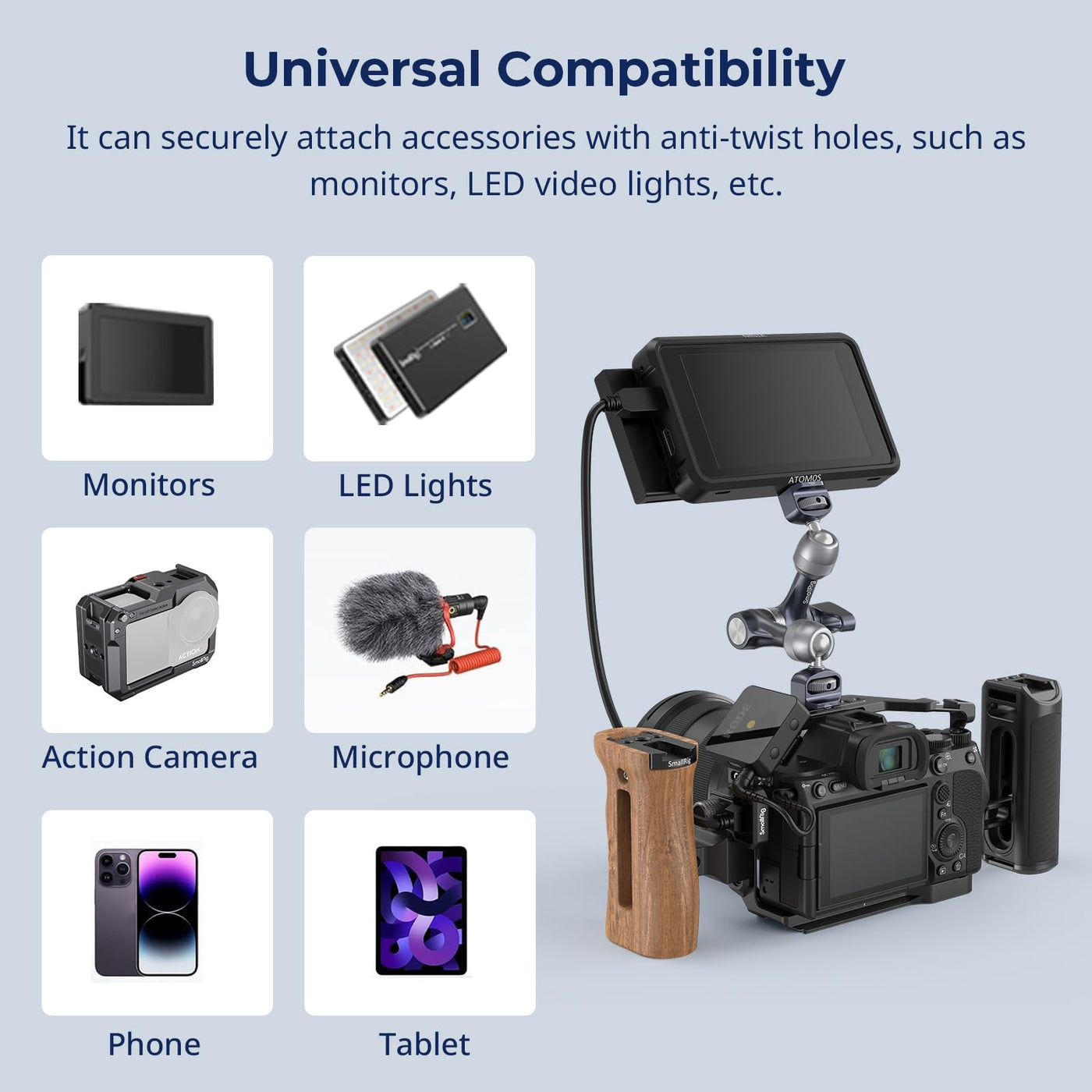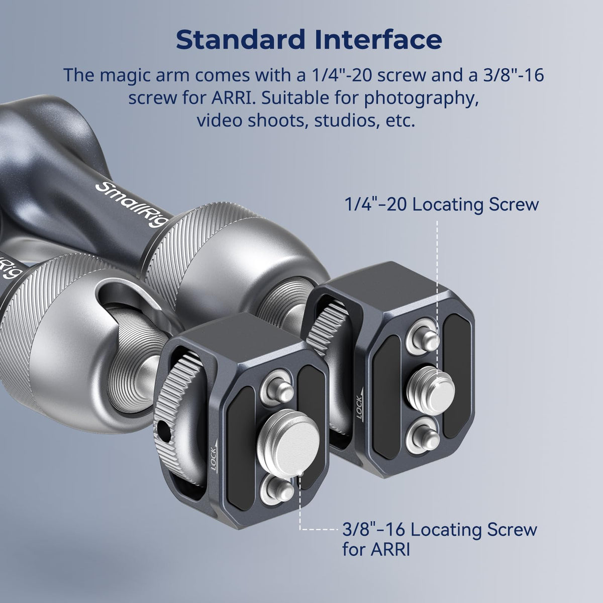 Smallrig Rosette Magic Arm (7) With 1/4-20 And 3/8-16 Locating Screw For Arri , Made Of Aircraft-Grade Aluminum And Stainless Steel, &Nbsp;Features 1/4-20 Screws And Stretchable Pins At One&Nbsp;End&Nbsp;3/8-16 Locating Screw For Arri&Nbsp;At Another&Nbsp;End&Nbsp;For Securely Attaching Such Accessories, Particularly With Anti-Twist Holes, As Monitors, Led Video Lights, Microphones, Mobile Phones, Action Cameras. The Thumbscrew Helps Lock Accessories And Has Holes For Hex Spanner For Further Tightening; And The Ball Heads, Which Are 360-Degree Adjustable, Come With A Spiral Pattern To Increase Friction And Bear Up To 3.5Kg / 7.7Lbs&Nbsp;Of Load. At The Stainless Steel Rosette Joint, There Is A Spring For Easier Angle Adjustment. An Ergonomically Designed Anti-Off Thumb Lever, With A Built-In Thrust Ball Bearing, Feels Smooth And Comfortable And Quickly Locks Arm And Ball Heads In A Second. This Rosette Arm Is Cnc Machined For More Robustness And Durability And Also Equipped With Pads On Both Accessory Mounts To Prevent Scratches. Specifications Product Dimensions:&Nbsp;115.5 X 68.0&Nbsp;X 25.4Mm / 4.5&Nbsp;X 2.6&Nbsp;X 1.0In Package Dimensions: 120.0&Nbsp;X 102.5 X 43.0Mm / 4.7&Nbsp;X 4.0&Nbsp;X 1.6In Product Weight: 215.0 ?5.0G / 7.5&Nbsp;?0.2Oz Package Weight: 259.5&Nbsp;?5.0G / 9.1&Nbsp;?.2Oz Material(S): Aluminum Alloy, Stainless Steel Related Products 4488?4900?3959?4194?3873?3874?3875 In The Box Rosette Arm ?1