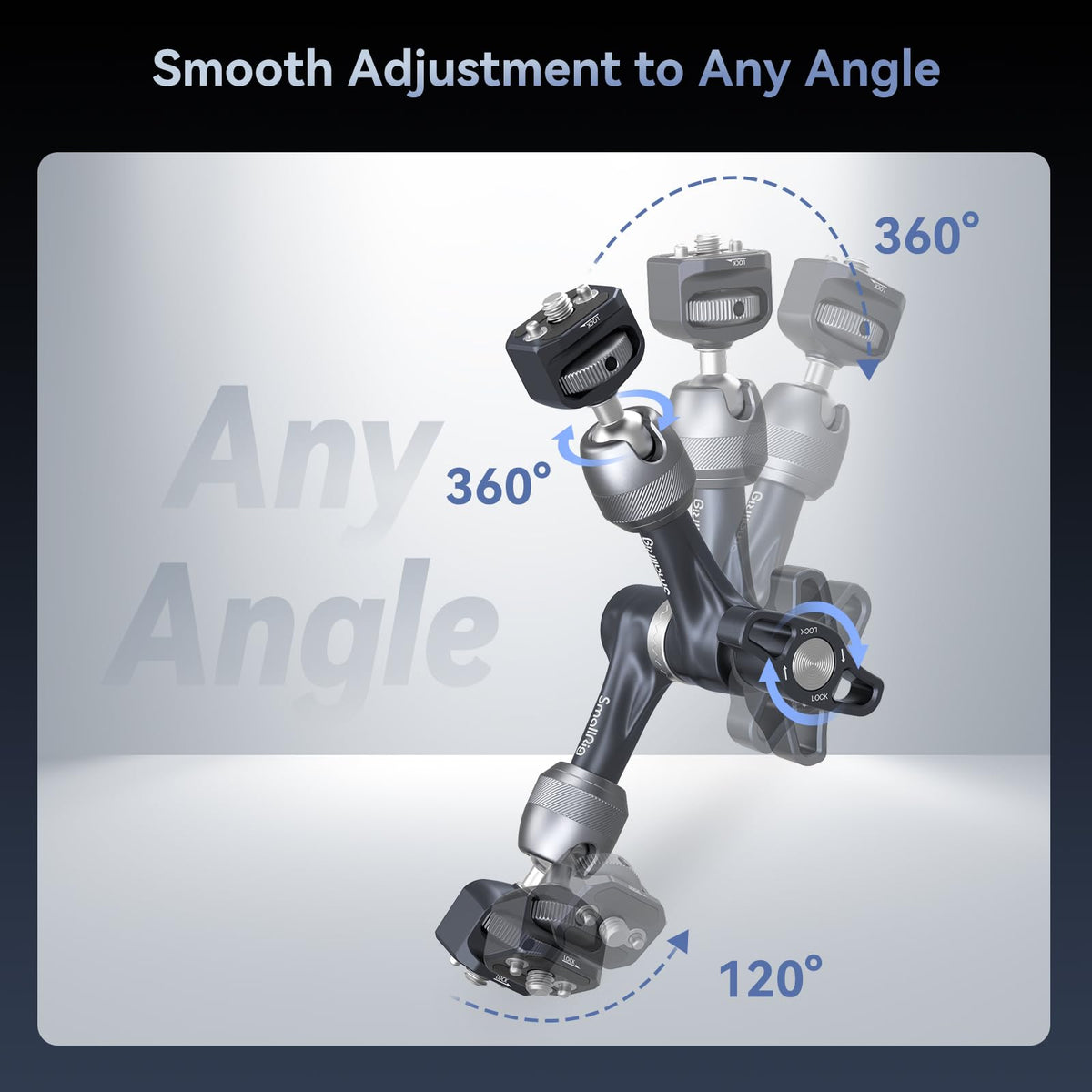 Smallrig Magic Arm With Rosette Gear (7) Made Of Aircraft-Grade Aluminum And Stainless Steel,&Nbsp;Features 1/4-20 Screws And Stretchable Pins At Both Ends For Securely Attaching Such Accessories, Particularly With Anti-Twist Holes, As Monitors, Led Video Lights, Microphones, Mobile Phones, Ipads, Action Cameras.&Nbsp; The Thumbscrew Helps Lock Accessories And Has Holes For Hex Spanner For Further Tightening;&Nbsp; And The Ball Heads, Which Are 360-Degree Adjustable, Come With A Spiral Pattern To Increase Friction And Bear Up To 3Kg Of Load. At The Stainless Steel Rosette Joint, There Is A Spring For Easier Angle Adjustment.&Nbsp; An Ergonomically Designed Anti-Off Thumb Lever, With A Built-In Thrust Ball Bearing, Feels Smooth And Comfortable And Quickly Locks Arm And Ball Heads In A Second.&Nbsp; This Rosette Arm Is Cnc Machined For More Robustness And Durability And Also Equipped With Pads On Both Accessory Mounts To Prevent Scratches.