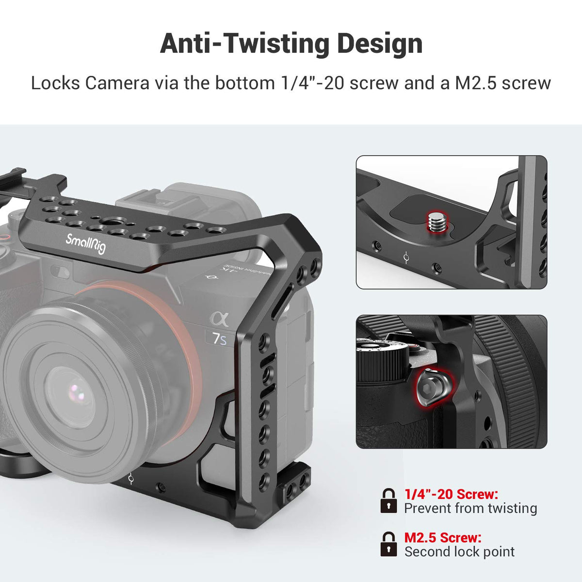 Smallrig Camera Cage For Sony Alpha 7S Iii / A7S Iii / A7S3 2999 Key Features: 1.Formfitting Full Cage 2.Firmly Fixed To Camera By A 1/4-20 Screw And An M2.5 Screw 3.1/4-20 & 3/8-16 Threads And Arri-Style Mounts 4.Integrated Nato Rail And Cold Shoe Mount 5.Built-In Screwdriver On The Bottom Designer: Tracy Joy Compatibility: For Sony A7S Iii Package Includes: 1 X Cage Product Dimensions: 145.5 X 106.5 X 64Mm Package Dimensions: 165 X 155 X 85Mm Net Weight: 220G5G Package Weight: 290G5G Material(S): Aluminum Alloy
