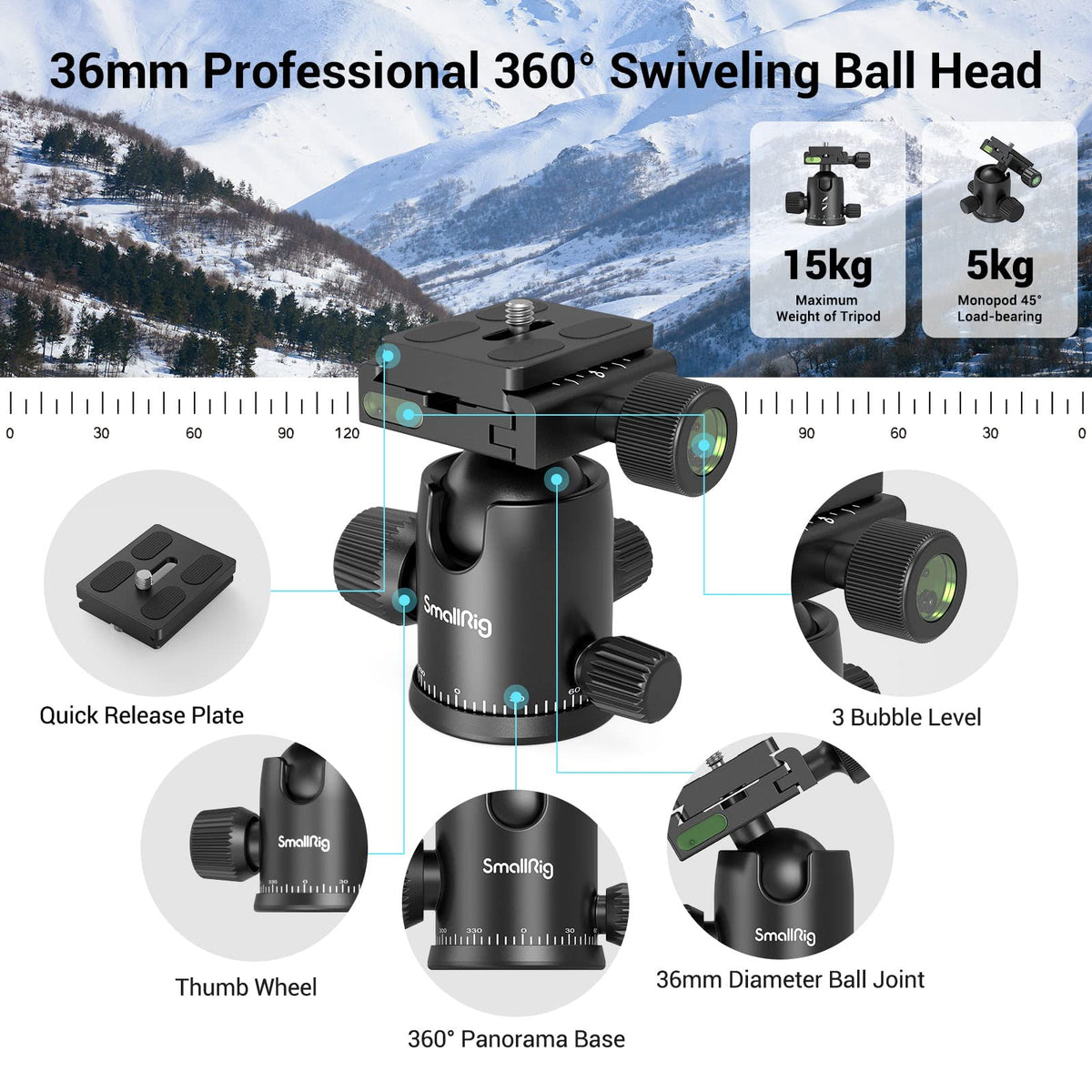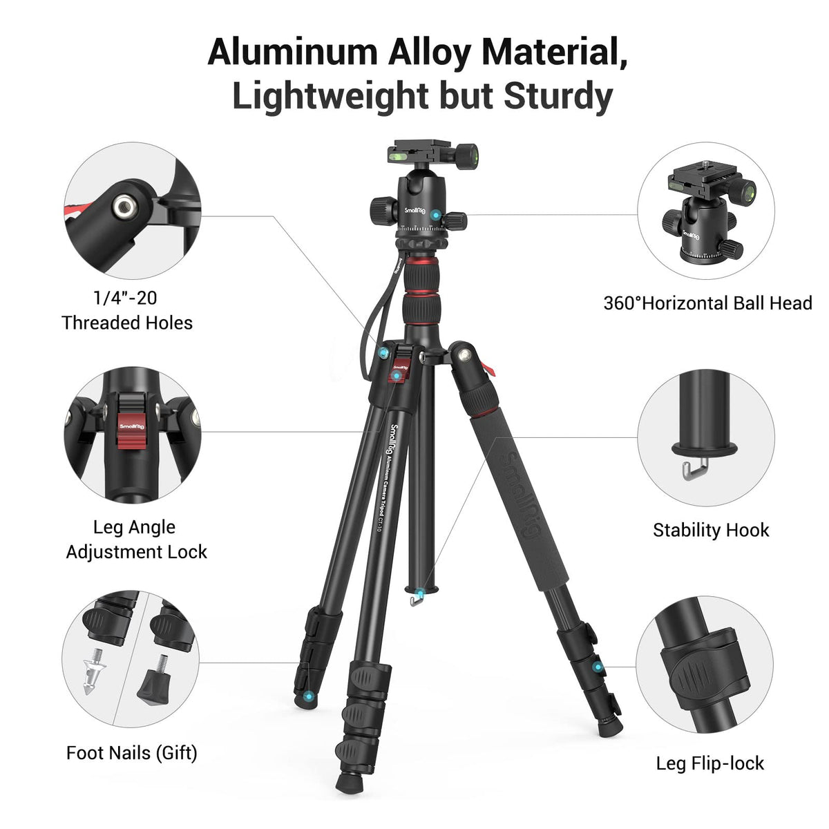 Smallrig 71 Camera Tripod, Foldable Aluminum Tripod & Monopod, 360Ball Head Detachable, Payload 33Lb, Adjustable Height From 16 To 71 For Camera, Phone