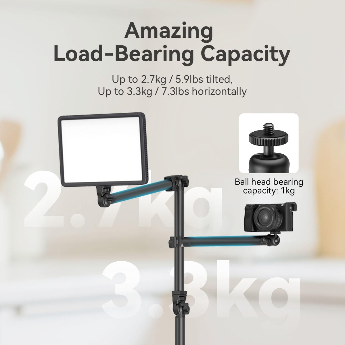 Smallrig Live Desktop Camera Bracket Dt-50 Smallrig Live Desktop Camera Bracket Dt-50 4456 Is Suitable For Indoor Live Broadcasts, Creating Eye-Level, Top-Down, Or Dutch Angle Photo/Video, Video Conferencing Or Recording, And More. Key Features: 1. Multi-Angle Shooting: Adjustable Bracket Supports 360 Rotation 2. Mobility:The 3-Section Detachable Articulated Arm Is Flexible To Combine And Easy To Customize And Carry 3. Load-Bearing Capacity: 2.7Kg/5.9Lbs Tilted And 3.3Kg/7.3Lbs Horizontally 4. The Bracket Comes With An Aluminum Alloy Crab-Shaped Clamp And Holding Arm Allowing The Connection Of An Additional Device For Efficient Shooting 5. Highly Compatible: 1/4 -20 Screw, Phone Clip, Lamp Holder, 1/4-20 To 3/8-16 Adapter And 1/4-20 To 5/8-11 Adapter. Specifications: Product Dimensions: 1080 X 68 X 40Mm / 42.5 X 2.7 X 1.6In Package Dimensions: 340 X 200 X 100Mm / 13.4 X 7.9 X 3.9In Product Weight: 930G 30G / 33 1.0Oz Package Weight: 1150G 50G / 40.6 1.7Oz Material(S): 75% Aluminum Alloy, 21% Abs, 3% Iron And 1% Copper Maximum Height: 980Mm Articulated Arm Sections: 3 Articulated Arm Section Length: 32Cm / 12.6In Articulated Arm Section Diameter: 25Mm / 1.0In Articulated Arm Head Rotation: 180 Articulated Arm Load Capacity: 2.7Kg - 3.3Kg / 5.9 - 7.3Lbs C-Clamp Gripping Distance: < 67Mm / < 2.6In Crab-Shaped Clamp Gripping Distance: 22Mm - 28Mm / 0.9 - 1.1In Holding Arm Length: 30Cm / 11.8In Ball Head Diameter: 15Mm / 0.6In Ball Head Load Capacity: < 1Kg / < 2.2Lbs Phone Clip Applicable Width: 58-85Mm / 2.3 - 3.3In