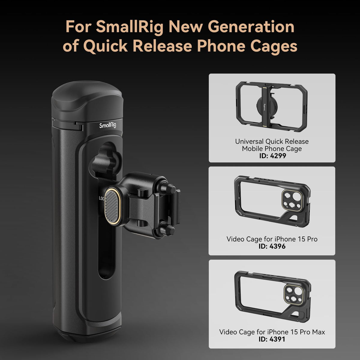 Q: What devices are compatible with the SMALLRIG Quick Release Side Handle?A: The SMALLRIG Quick Release Side Handle is compatible with the SMALLRIG Universal Quick Release Mobile Phone Cage 4299 and the SMALLRIG Cage for iPhone 15 Series.
