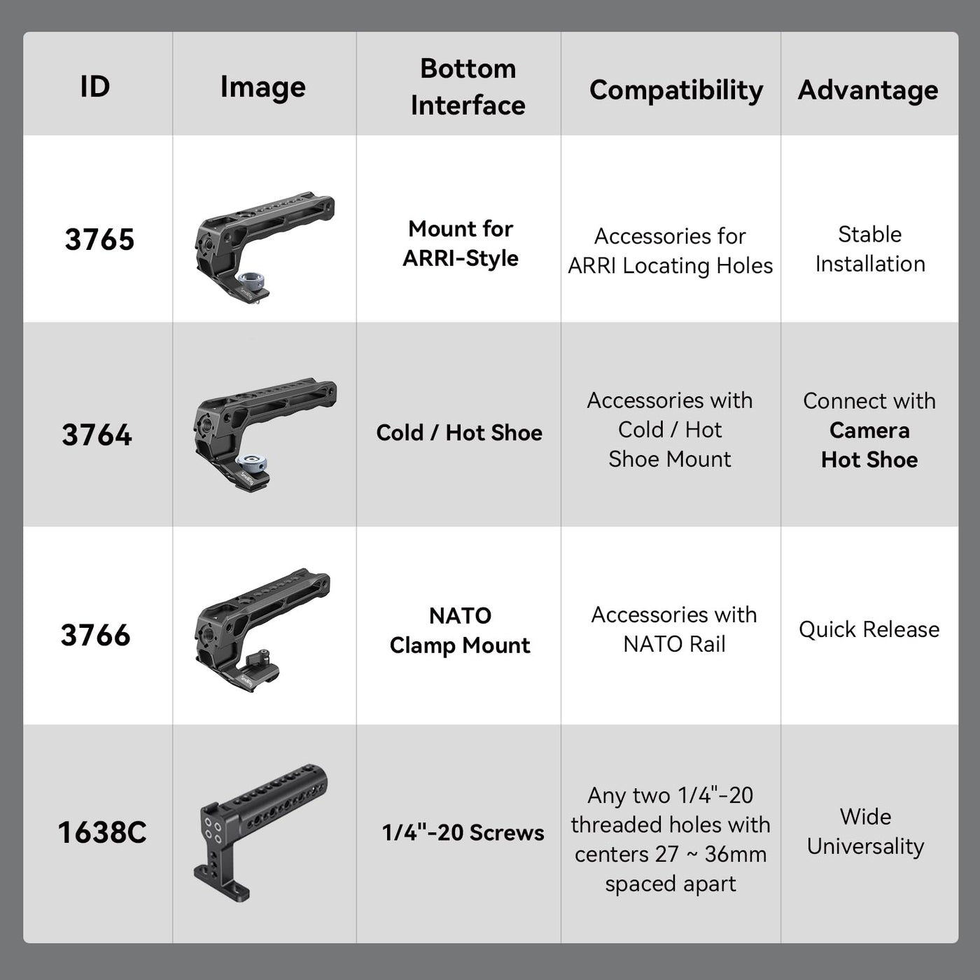 Smallrig Top Handle With Locating Holes For Arri 3765(Lite) Key Features: 1. Ergonomically Designed To Improve Grip Experience And Reduce Burdens On Arms. 2. Mostly Made Of Aluminum Alloy, Together With Anti-Slip And Anti-Freeze Silicone. 3. Hollowed-Out Design Makes It Weigh Only 124G. 4. 5 Built-In Cold Shoe Mounts For Microphone, Led Light, Monitor, Etc. Note: Maximum Load Capacity Is 10Kg Compatibility: Cages With Arri 3/8 -16 Locating Hole In The Box: 1 X Top Handle 1 X Allen Wrench Product Dimensions: 135 X 24.5 X 74.3Mm Package Dimensions: 156 X 83 X 43Mm Net Weight: 124G5G Package Weight: 179G5G Material: Aluminum Alloy, Silicone, Stainless Steel