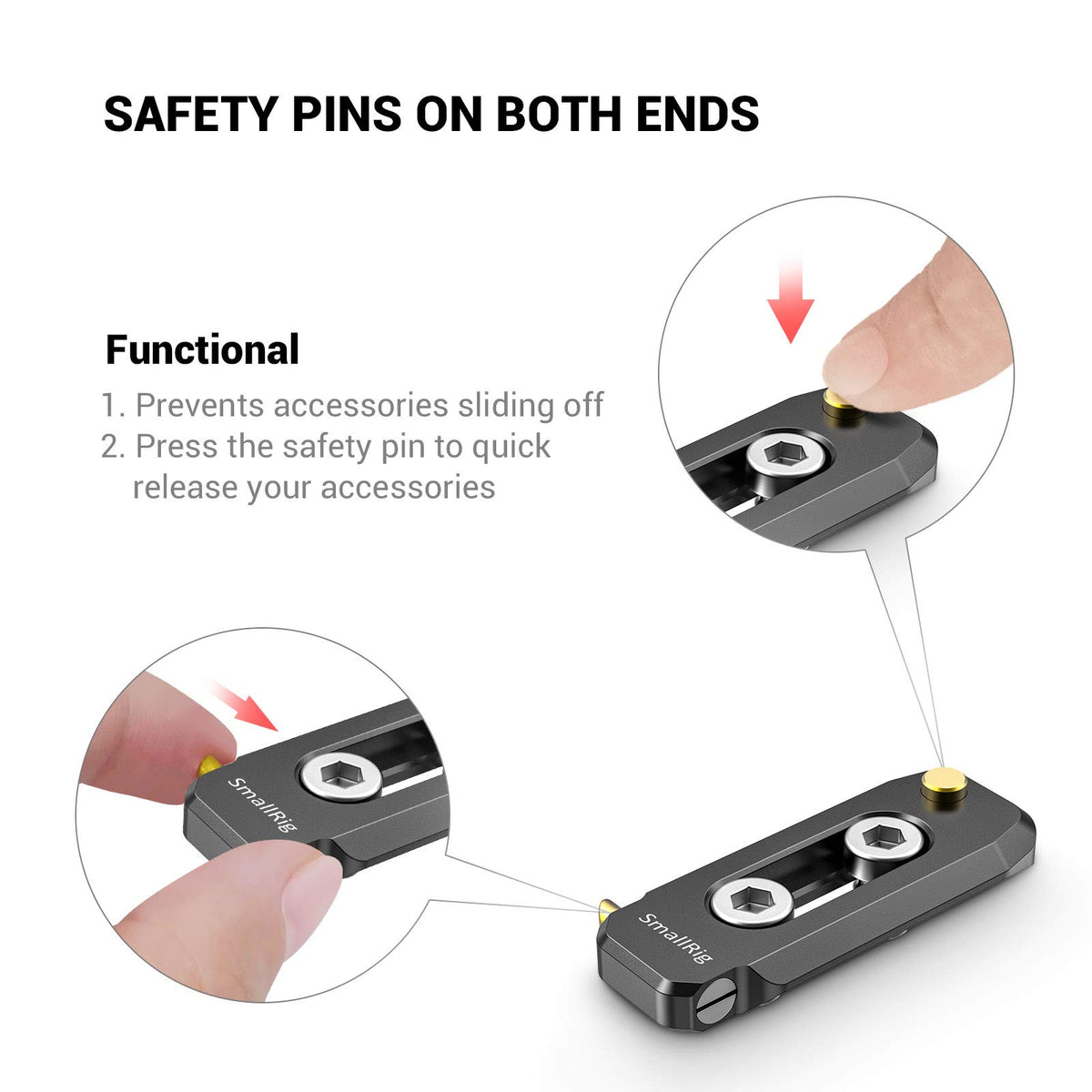 Q: What safety features does the SMALLRIG NATO Rail offer?A: The SMALLRIG NATO Rail features spring-loaded safety pins on both ends to prevent accessories from accidentally sliding off during use.