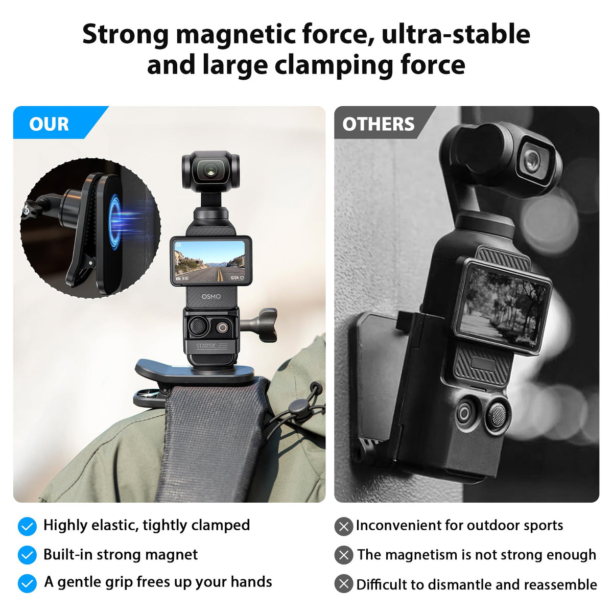 Q: Is the STARTRC OSMO Pocket 3 Backpack Clip Mount compatible with other camera brands?A: Yes, the STARTRC OSMO Pocket 3 Backpack Clip Mount is designed for wide compatibility, supporting various cameras including DJI Osmo Pocket 3/2/1, Action 5 pro, GoPro models (Hero 12, 11, 10, 9, 8, 7, 6, 5, 4/3+), Insta360 One R, One X2, and many other wearable cameras.