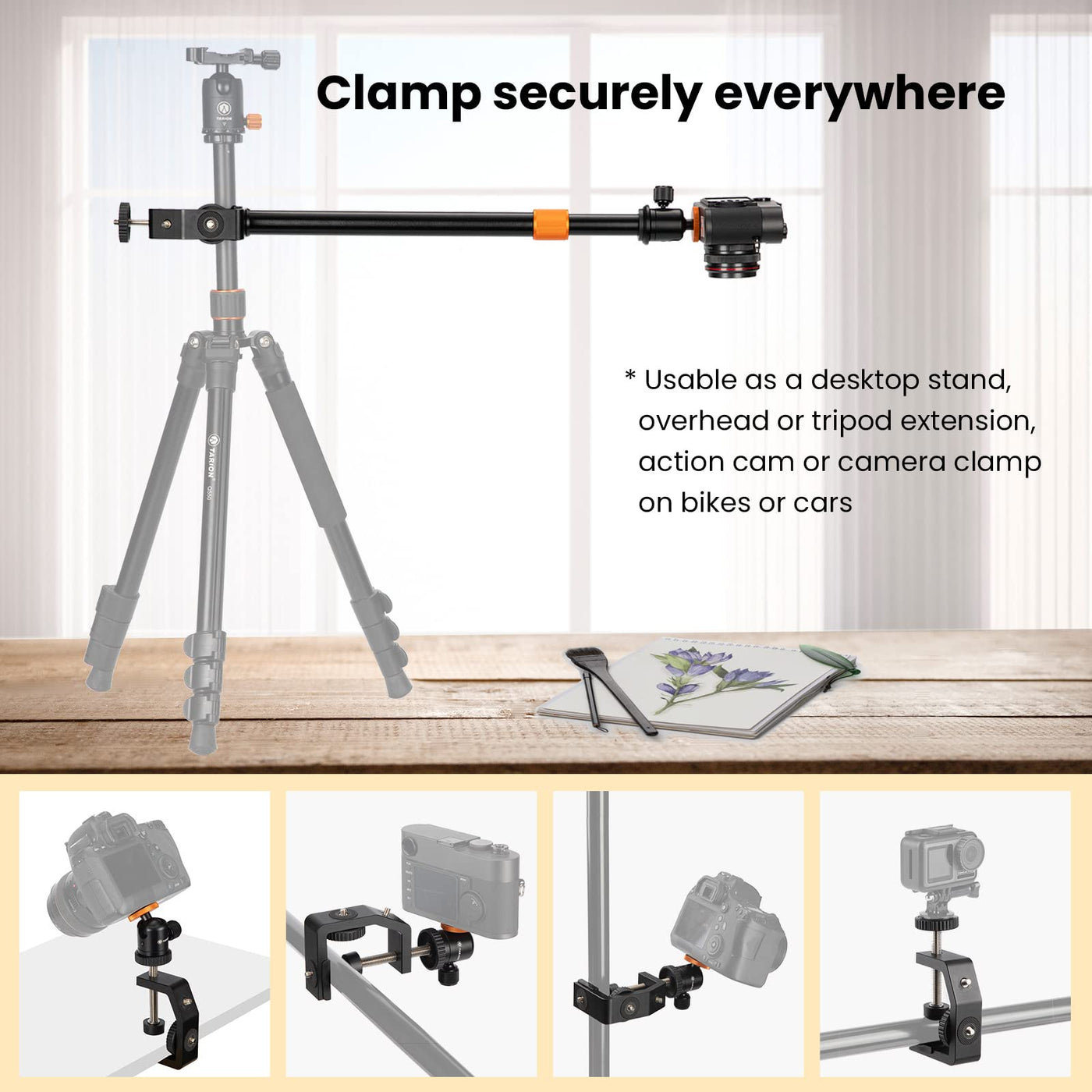 ?Great Compatibility?The Table Mount C-Clamp Features 4 X 1/4' Screw Connection Points In Different Directions, Catering To Different Shooting Angles. The Universal 1/4-Inch Screw Can Connect Various Devices Like Cameras, Lights, Camcorders, Microphones And Others | ?Use Anywhere? With A Maximum Grip Range Of 1.18In(30Mm), This C Clamp Camera Mount Offers Unlimited Possibilities On Various Surfaces Such As Workbenches, Fences, Desks, Bikes, Car Windows, Camera Tripod Stands, And More. Almost Everywhere | ?Flexible & Versatile?This Camera Desk Mount Clamp Includes A Mini 360� Ball Head For Flexible Angle Adjustments, Securely Lockable With A Knob. Its Sturdy Aluminum Alloy Ball Head Connects To Different Devices By Standard 1/4' Screw/Thread For Reliable Photography/Videography Setups | ?Sturdy?Made From Aluminum Alloy, The Super Clamp And Ball Head Are Lightweight, Stable, And Durable. Featuring Rubber Pressure Points That Protect Surfaces And Ensure Stability. The Ball Head Of This Camera Mount Can Support Camera Gears Up To 6.6Lbs(3Kg) | ?Portable? The C Clamp Weighs Only 0.7Lb(320G), Making It Convenient For On-The-Go Shooting. It Can Be Attached To Desks, Car Windows, Fences, Railings Or Light Tripod Stands For Live Streaming, Outdoor/Hiking/Mountain Biking/High-Road/Miniatures Photography/Videography, Social Media Video Making, And More