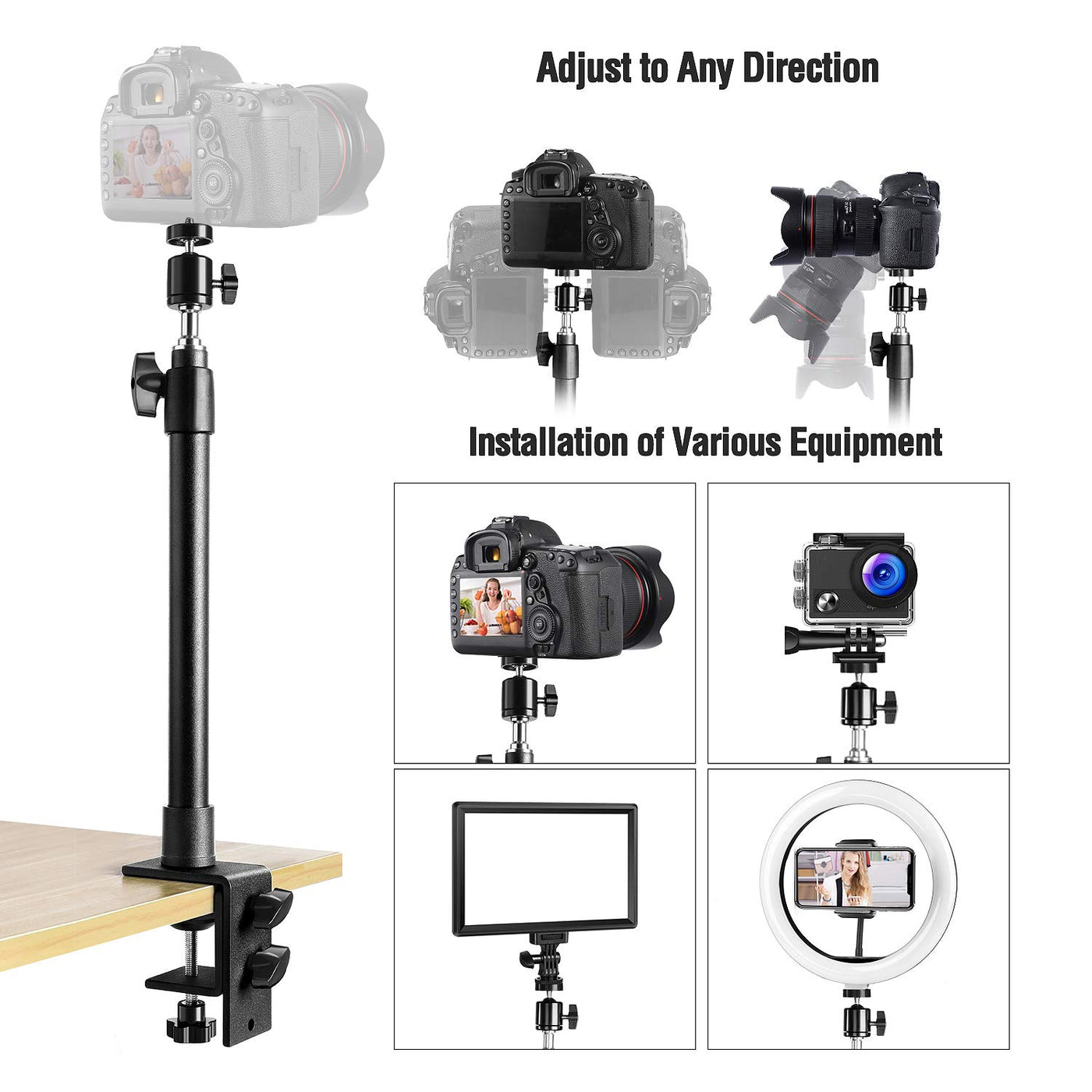Package Contents: 1X C-Clamp 1X Adjustable Desk Mount Light Stand