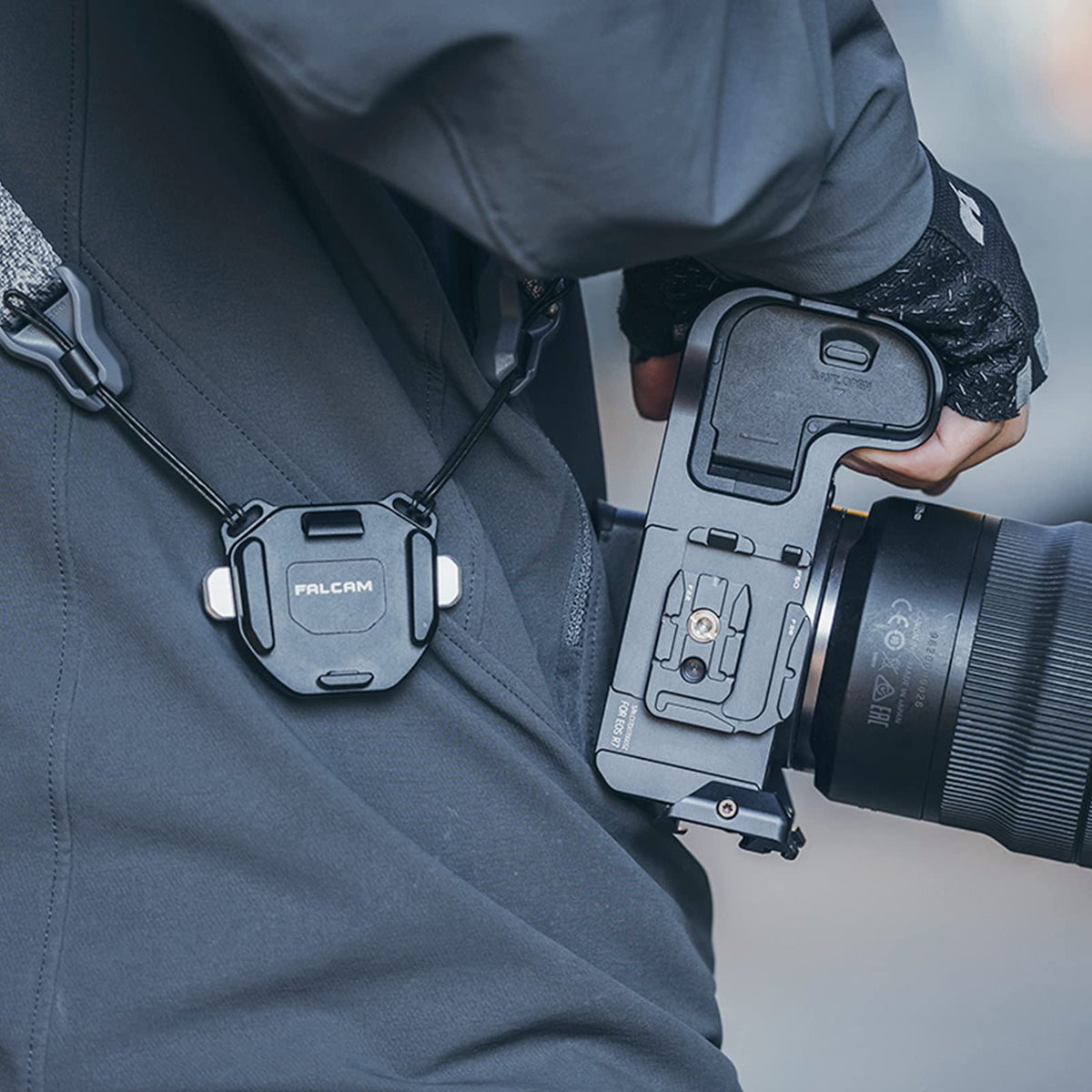Q: How does the quick release feature work on the FALCAM F38 V2?A: The quick release feature allows for fast attachment and detachment of your camera from the shoulder strap. The V2 Base is designed to adapt to the most common Arca standard square quick release plates, providing a seamless mounting experience.