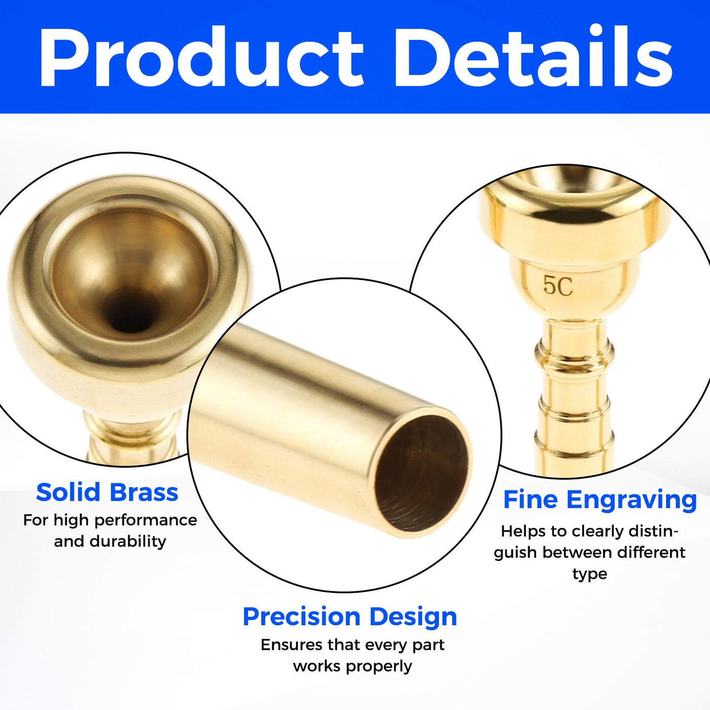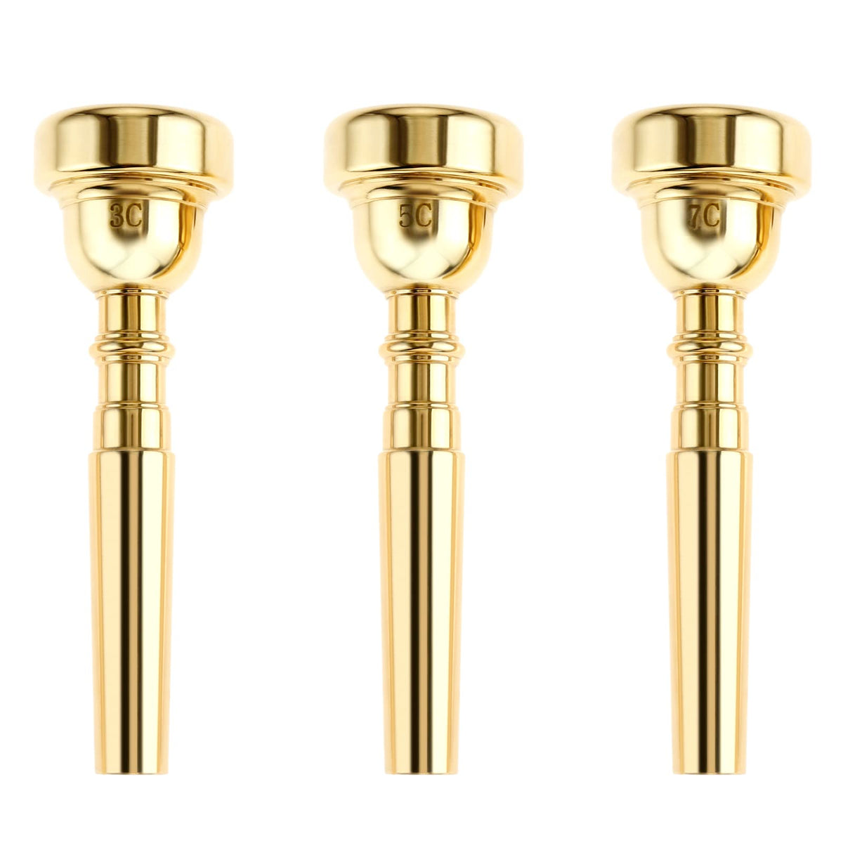 3 Pack Trumpet Mouthpiece 3C 5C 7C, Goldspecification:>Material: Brass>Color: Gold>Dimention: 3.4X1 In/8.6X0.98''Features:>Made Of Good Brass, Offer Comfortable Touch Feeling And Nice Sound, For Long-Term Use.>Carved With Different Types On Surface, Clearly Distinguish Different Types In A Very Short Time.>Three Types Can Be Changed According To Different Songs, Playing Venue And Learning Stages Of Different Performers.>Precise Design For Each Parts Help To Ensure Trumpet Mouthpiece Works Well>Compatible With Most Standard Trumpets Such As Bach, Conn,King And So On.>Nice Option For Trumpet Beginners,Professional Players,Kids,Adults.Package Includes: >1X 3C,1X 5C, 1X7C Of Trumpet Mouthpieces, 1X Exquisite Box,1X Blue Cleaning Cloth.