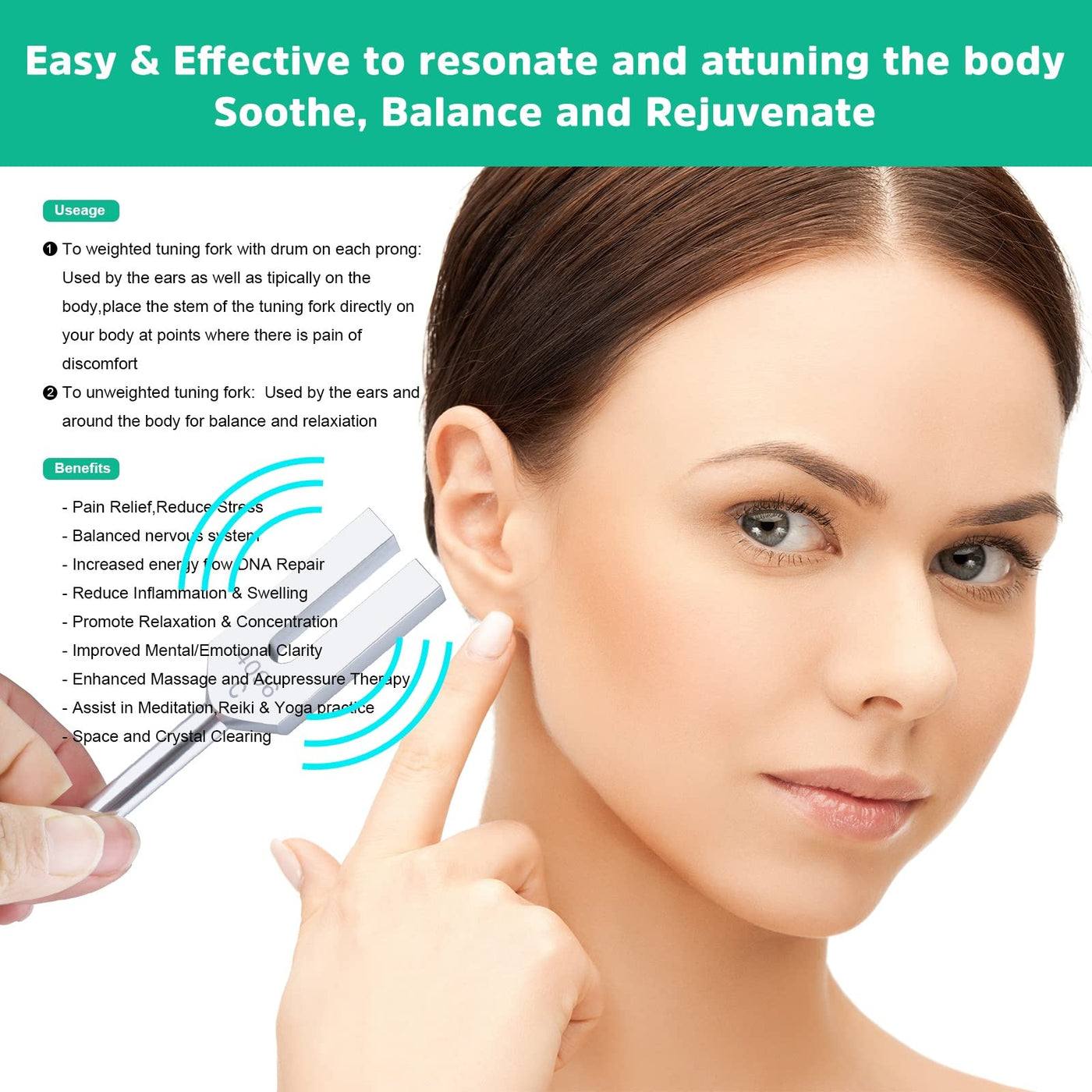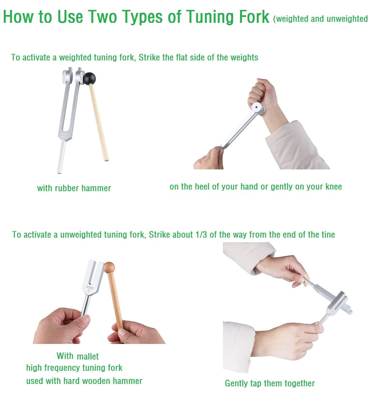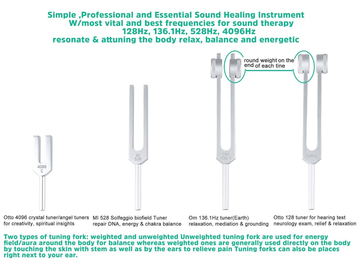 Tuning Fork Set Is Simple And Effective Sound Healing Instrument With The Best Frequencies (128Hz, 1361Hz, 528Hz,4096Hz) To Attune Your Body Relax, Balance And Energetic They&Nbspresonate At A Specific Andconstant Pitch Throughout Your Whole Body, Activate And Replenish The Naturalenergy Flow Qi Through All The Organ Systems To Reconstruct A Healthier Body Benefits: Pain Relief, Reduce Stress Balanced Nervous System Increased Energy Flow, Dna Repair Reduce Inflammation & Swelling Promote Relaxation & Concentration Improved Mentalemotional Clarity Enhanced Massage And Acupressure Therapy Assist In Meditation, Reiki & Yogapractice Space And Crystal Clearing Instructions: Ol> Loosely Hold The Tuning Fork By Thehandlestem With Your Thumb And Index Finger, And Relax Your Wrist Strike The Tuning Fork With Mallet, Onthe Heel Of Your Hand Or On Your Knee Bring The Tuning Fork Closer To Your Earto Listen, Pan And Whirl Around The Bodys Chakra Aura Slowly, Stick Theweighted Tuning Fork Handlestem To The Human Acupoints Or In The Chest, Neckand Spinal Cord, Head Directly To Vibrate And Transfer Energy, And Point Thefork Tip To The Spacefooddrink That You Want To Infuse Energy), It Isrecommended To Repeat The Process 1-3 Times Ol>
