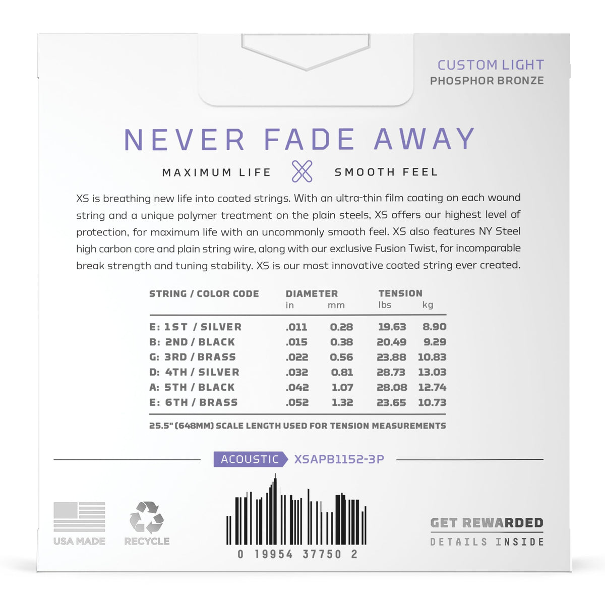 Born From Our Greatest Breakthrough In String Innovation, Xs Phosphor Bronze Strings Have The Longest Life Of Any D�Addario Acoustic Guitar String. The Xs Coating Gives Our Warm, Balanced Phosphor Bronze Strings Maximum Life, With An Uncommonly Smooth Feel. Made With A Ny Steel Core, Phosphor Bronze Wrap Wire And Fusion Twist Technology, Xs Coated Acoustic Guitar Strings Have Incomparable Break Strength And Tuning Stability, In Addition To Their Dramatically Increased Lifespan. This 11-52 Custom Light Gauge Set Has Slightly More Volume And Projection Than Extra Light, While Still Being Easy To Play. Xs Is Breathing New Life Into Coated Strings. With Its Ultra-Thin Film Coating On Every Wound String And Unique Polymer Treatment On The Plain Steels, Xs Offers Our Highest Level Of Protection For Maximum Life With An Uncommonly Smooth Feel. Xs Also Features Ny Steel High Carbon Core And Plain String Wire, Along With Our Exclusive Fusion Twist, For Incomparable Break Strength And Tuning Stability. Xs Is The Most Innovative Coated String Ever Created.
