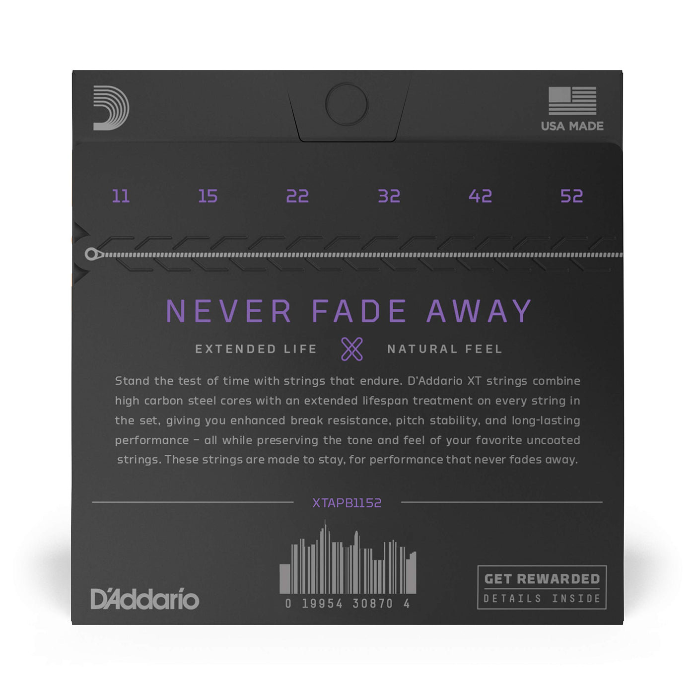 Since D'Addario Introduced Phosphor Bronze Acoustic Guitar Strings In 1974, They'Ve Been Synonymous With Warm, Well-Balanced Tone. Xt Phosphor Bronze Offers That And More, Boasting Enhanced Break Resistance, Better Pitch Stability, And Longer Life Than Our Standard Phosphor Bronze Strings. The Xt Coating Delivers Advanced Corrosion Resistance, While Still Retaining The Warm Tone And Natural Feel Of The Uncoated String. Beneath The Coating, These Xt Acoustic Strings Are Constructed With A Ny Steel Core, Phosphor Bronze Wrap Wire, And Fusion Twist Technology, Affording Tonal Versatility With Added Resilience, Excellent For A Wide Range Of Acoustic Styles. This 11-52 Custom Light Gauge Set Has Slightly More Volume And Projection Than Extra Light, While Still Being Easy To Play.