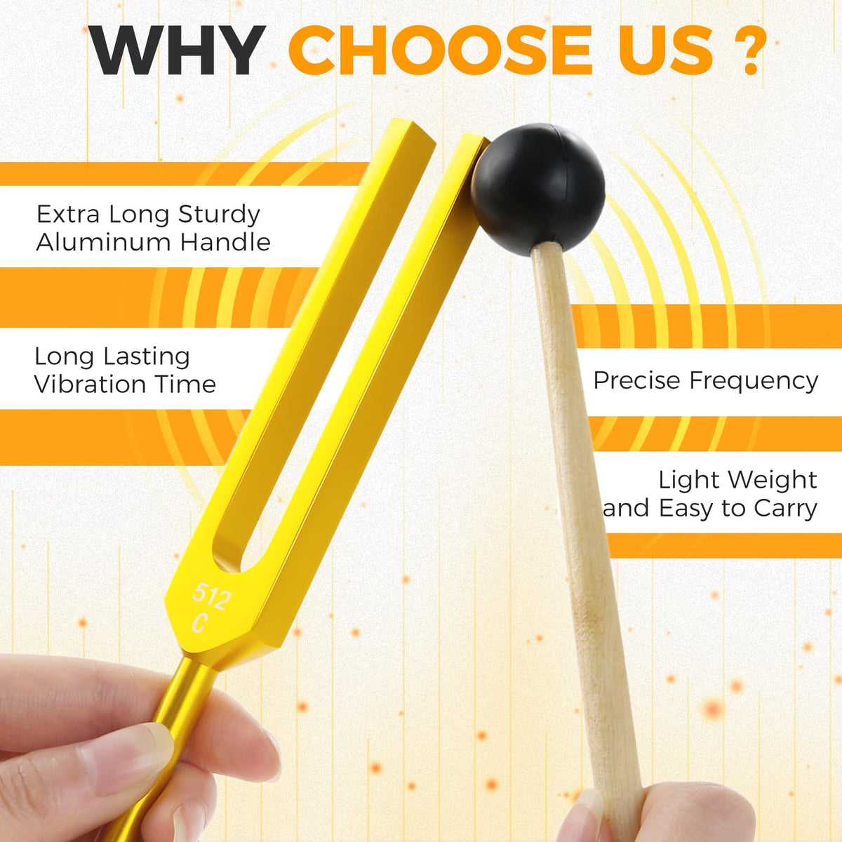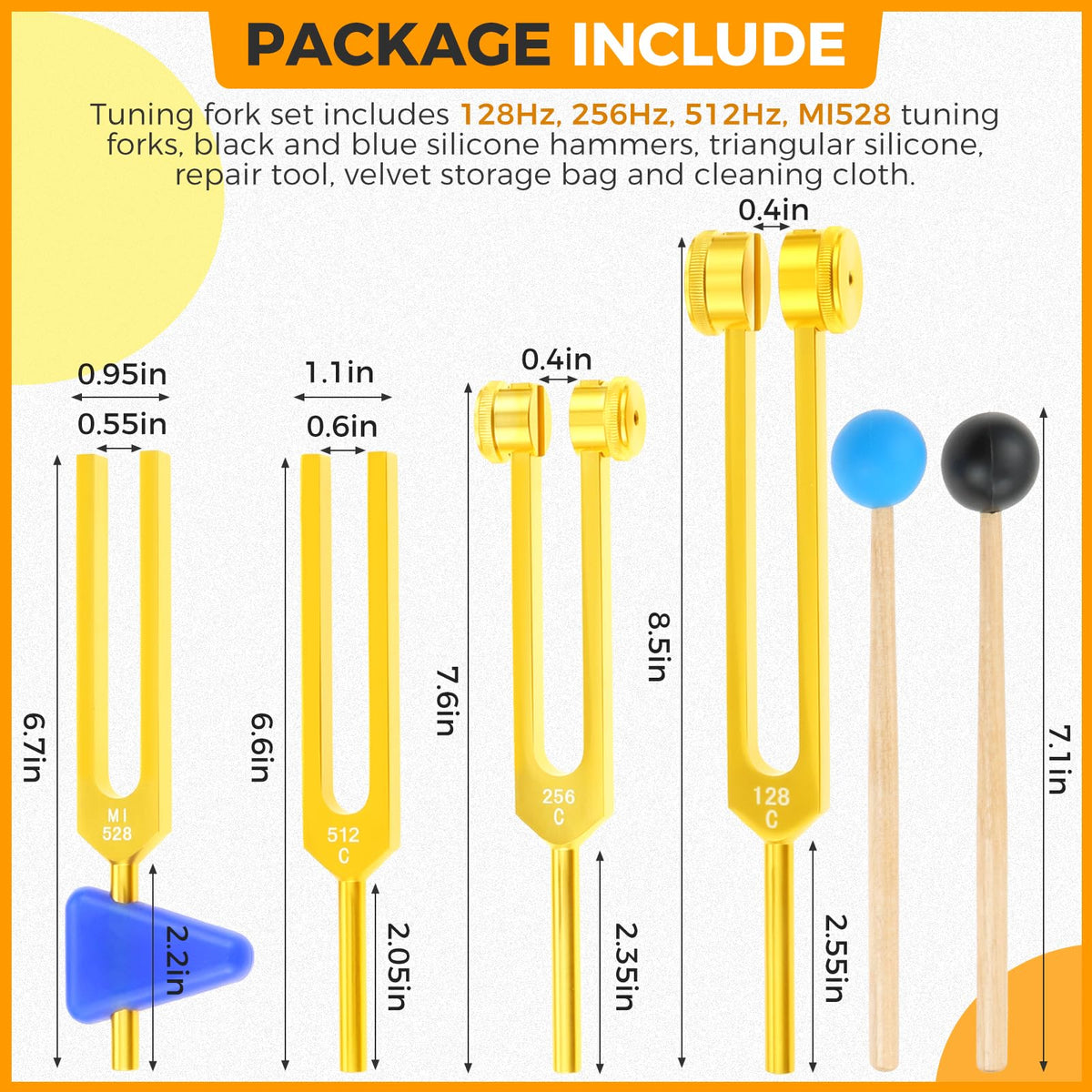 Etermeta 4 Pack Tuning Fork Set (128Hz, 256Hz, 512Hz, Mi528), Tuning Fork Chakra With Hammer, Triangular Silica Gel, Storage Bag And Cleaning Cloth(Gold)