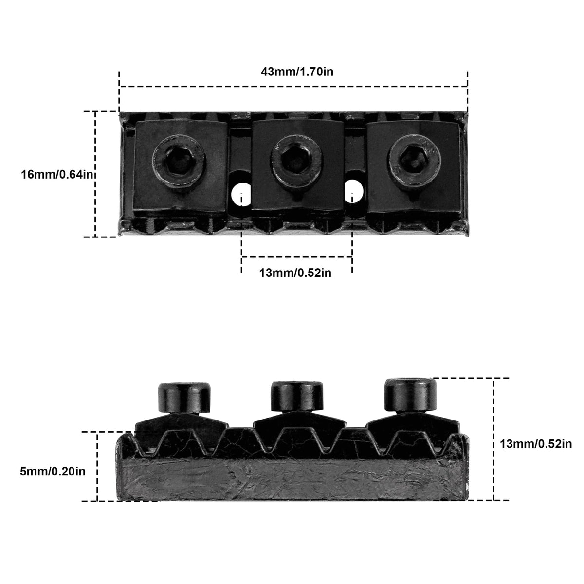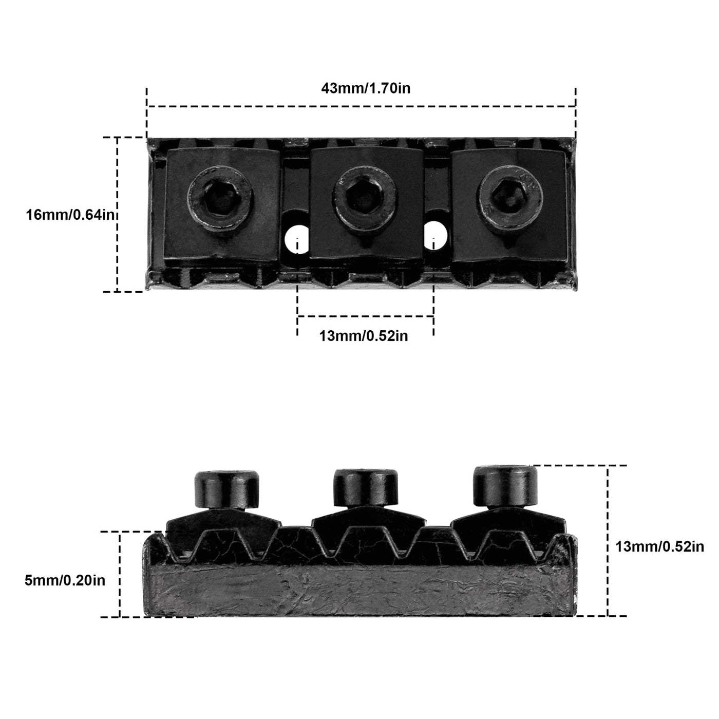 Specification: 100% Brand New,Never Used This Is A Top Mount Design In Which The Mounting Screws Go Through The Top Of The Unit. This Is The Larger Sized 42Mm Locking Nut Which Can Be Used With Your Double Lock System, Or It Can Be Used In Other Designs Also. Material : Metal Color: Black Length:42Mm Thickness:Approx.15.5Mm Height:5.5Mm-9Mm Annex:1X3Mm Six Angle Wrench+2Xscrew Package Included: 1X Electric Guitar Locking Nut 1X Six Angle Wrench 2 X Screw