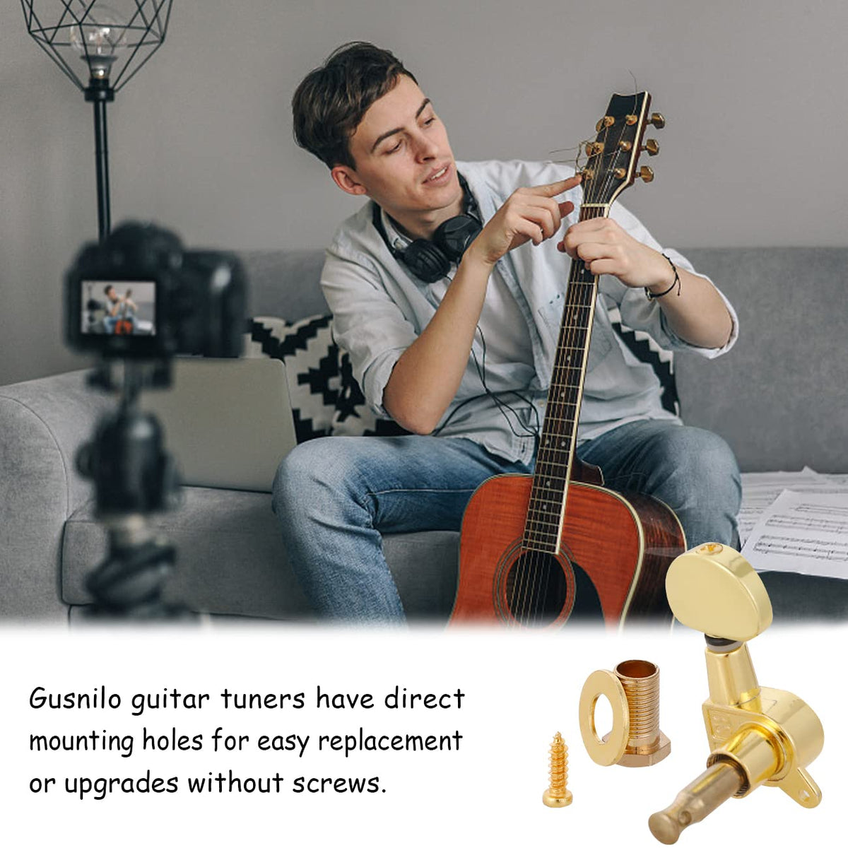 Gusnilo Guitar Tuning Pegs 6 Pcs 3L3R The Surface Of The Guitar Tuning Pegs Is A Layer Of Electroplated Gold With Heavy Duty Gears Inside Acoustic Guitar Tuning Pegs Feel Smooth And Accurate The Head Joint Of The Guitar Tuner Is Linked By Two Rubber Rings, Reducing The Friction Between The Head And The Guitar Tuning Pin, You Can Easily Twist The Knob Of The Guitar Tuning Pin Note: The Screw Holes Of Our Guitar Tuning Pegs Are 45A, Please Check Whether Your Guitar Can Be Used