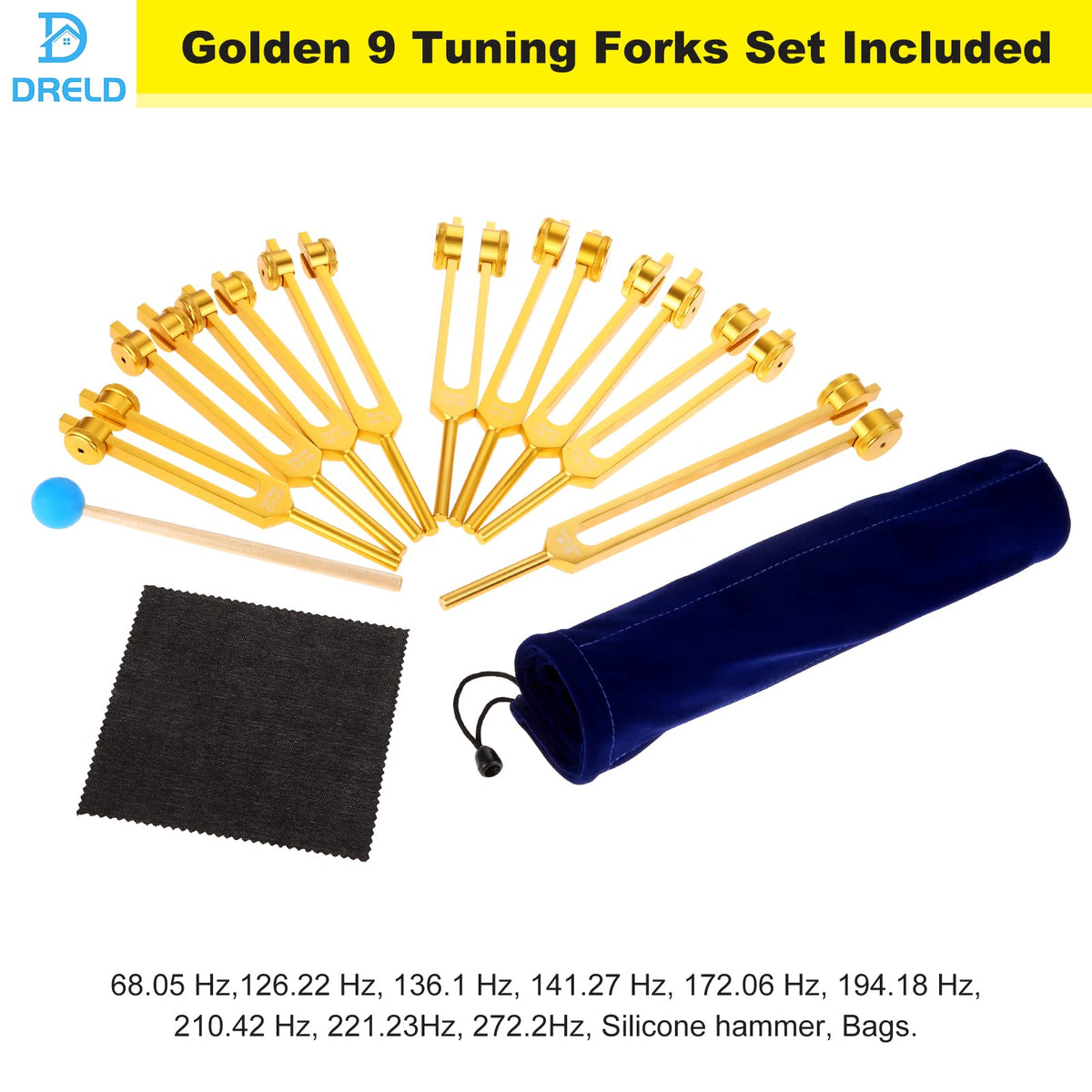 Compatible:>Set Of 9 Tuning Forks Suitable For Sound Therapy, Energy Work, Balance, Meditation, Stress Relief, Relaxation, Perfect For Health Professionals, Therapists, Vibration And Sound Therapists, Workshops.Pack Include:>1Pcs 68.05 Hz>1Pcs 126.22 Hz>1Pcs 136.1 Hz>1Pcs 141.27 Hz>1Pcs 172.06 Hz>1Pcs 172.06 Hz>1Pcs 194.18 Hz>1Pcs 210.42 Hz>1Pcs 221.23Hz>1Pcs 272.2Hz>1Pcs Silicone Hammer + Bags