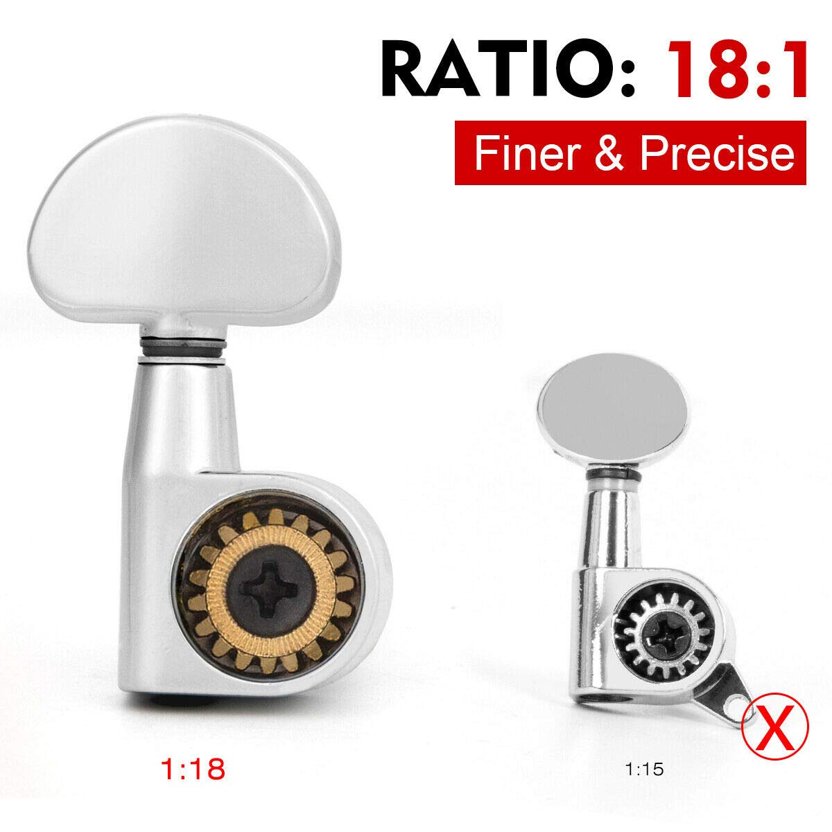 Three Tuning Machines Per Side. 18:1 Gear Ratio. Your Strings For Accurate Tuning. Package Includes: - 6Pcs Guitar Machine Head (3 Right And 3 Left) - 6Pcs Ferrule - 6Pcs Threaded - 6Pcs Screws