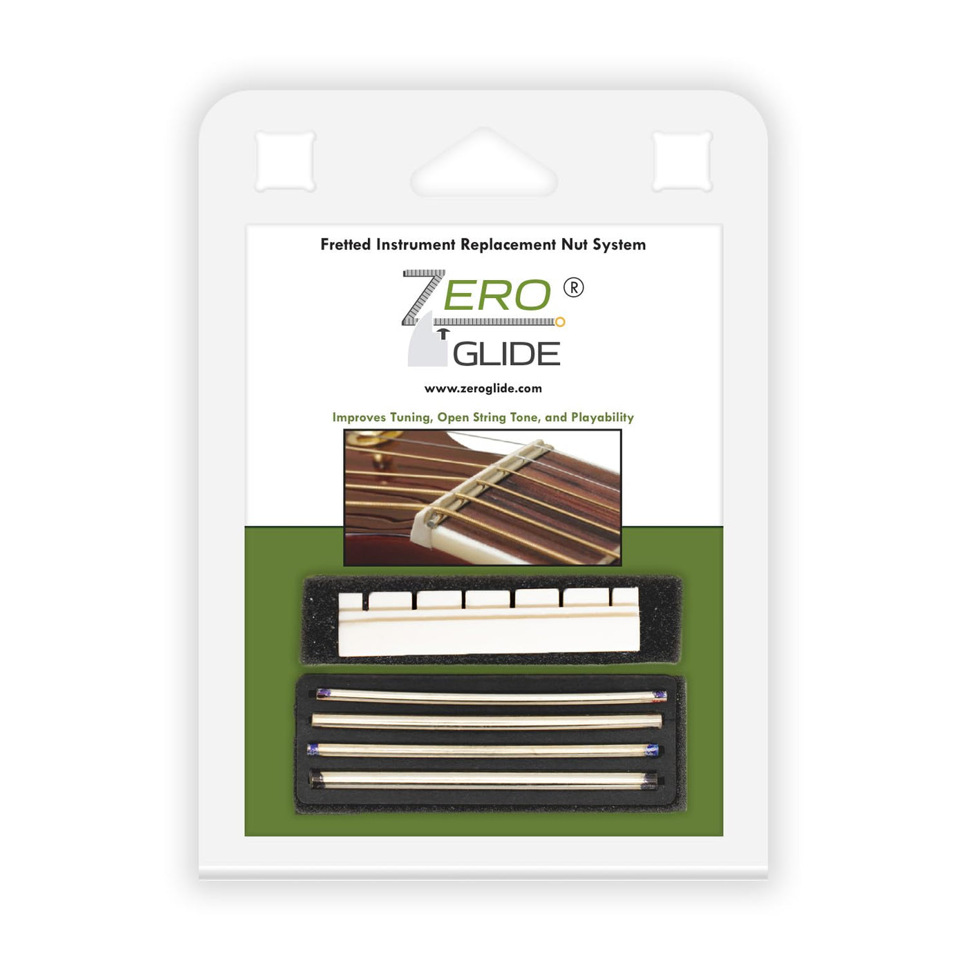 Zero Glide? Zero Fret Nut Slottedthe Zero Glide? Replacement Nut System Borrows The ''Zero Fret'' Concept To Reduce String Contact In The Nut By Up To 93%, Increasing Tuning Stability, Playability, And Open String Tone. It Only Takes A Few Minutes To Install With Absolutely No Permanent Alteration To Your Instrument.