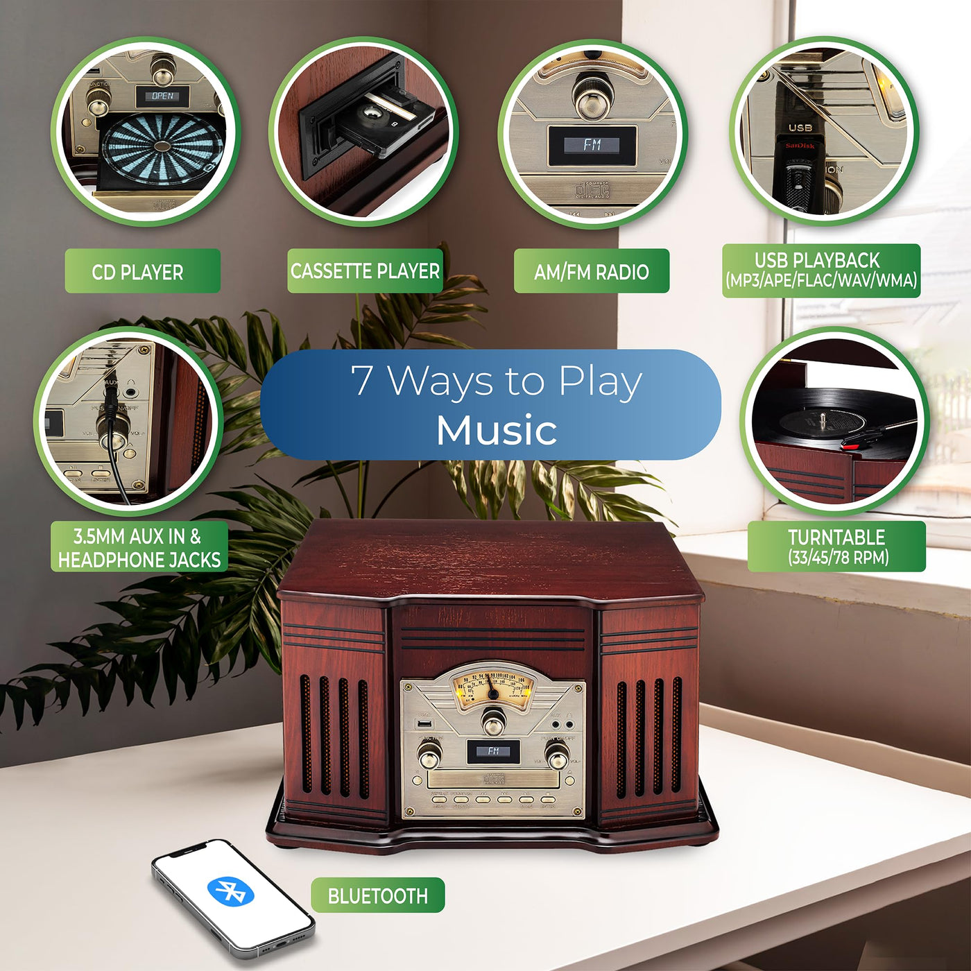 Clearclick All In One Turntable With 3 Speed Record Player, Bluetooth, Cd, Cassette Tape, Am/Fm Radio, Aux, Usb, Built In Speake