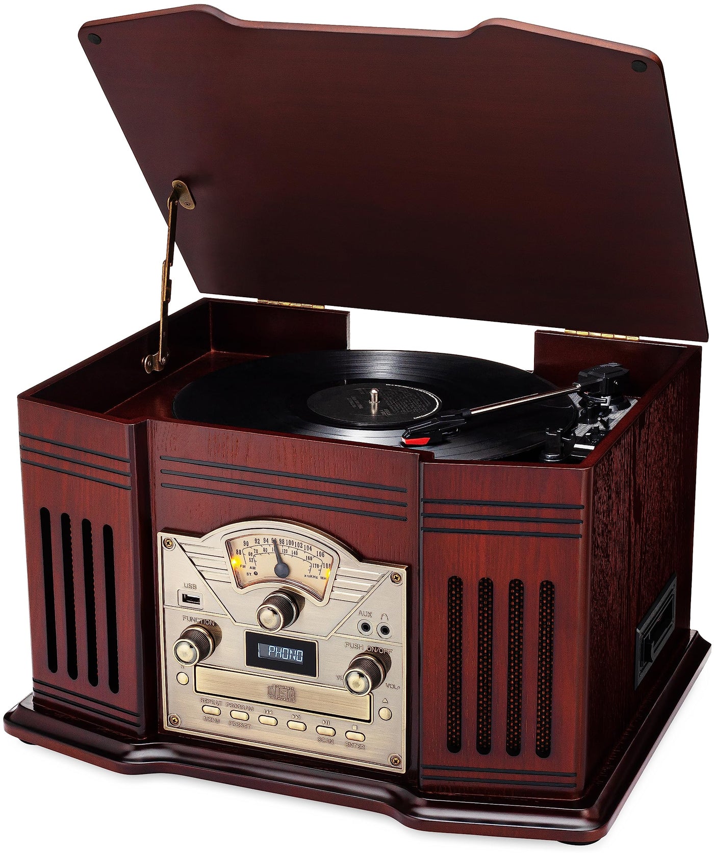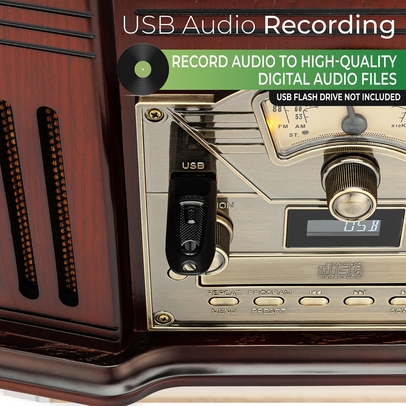 Introducing The Clearclick All-In-One Vintage-Style Turntable.This Audio Stereo System Is The Perfect Combination Of A Beautiful, Authentic-Looking Vintage Style With A Modern, High-Caliber Audio Experience.There'S Something For Everyone In This Record Player, Because There Are 7 Ways To Play Music: 3-Speed Turntable (33/45/78 Rpm), Bluetooth, Cd Player, Cassette Tape Player, Am/Fm Radio, Usb Playback.You Can Also Digitize Your Music Using This Device. It Can Record Digital Audio Files Using The Usb Encoding Feature (Usb Flash Drive Required, 64Gb Or Less; Not Included).Product Specifications: Dimensions: 17'' Width X 13'' Height X 10.5'' Length, Weight: Approximately 15 Lb, Power: 110V-120V North American Power Plug Only (For International Customers: 220V To 110V Step-Down Voltage Converter Required)