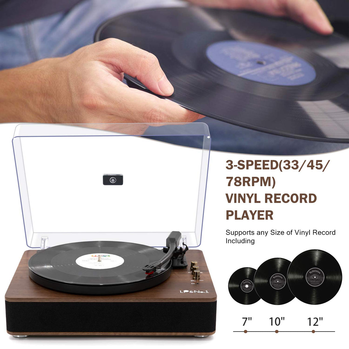 Vintage Wood Design & Wireless-Combines Vintage And Fashion Style Not Only Can Play Vinyl Records To Experience The Retro-Style Music And Atmosphere, You Can Also Play All Your Favorite Digital Music At Any Time Via Wireless Bluetooth Connection Playing Music From Mobile Phones, Mp3, Tablets And Other Wireless-Enabled Audio Devices 3-Speed & 3-Sizes Of Records-Belt-Driven System, Balanced Tone Arm With Soft Damping Control, Support Adjusting 3 Listening Speeds(33-13, 45 And 78 Rpm) And Playing 3 Sizes (7, 10 And 12) Of Records, Let You Enjoy Your Entire Record Collection Ortable&Lightweightwirelessly Play Music From Your Phone, You Can Take It Anywhere, Enjoy Your Life Great Ideal For Christmas Day, Father, Mother, And Friends Versatile Lp Turntable-Rca Output For Connecting With External Speaker, Headphone Jack For Listening Privately The Turntable Base Is Equipped With A Spring To Provide Shock Absorption And Improve Sound Quality Easily Removable Dust Cover Protects Your Vinyl Records From Damage Worry-Free Warranty Lifetime Technology-Support With 30-Day Money-Back Guarantee For Any Reasons,And Extra 60 Days Quality Warranty For Freely Returning And Exchanging New Products