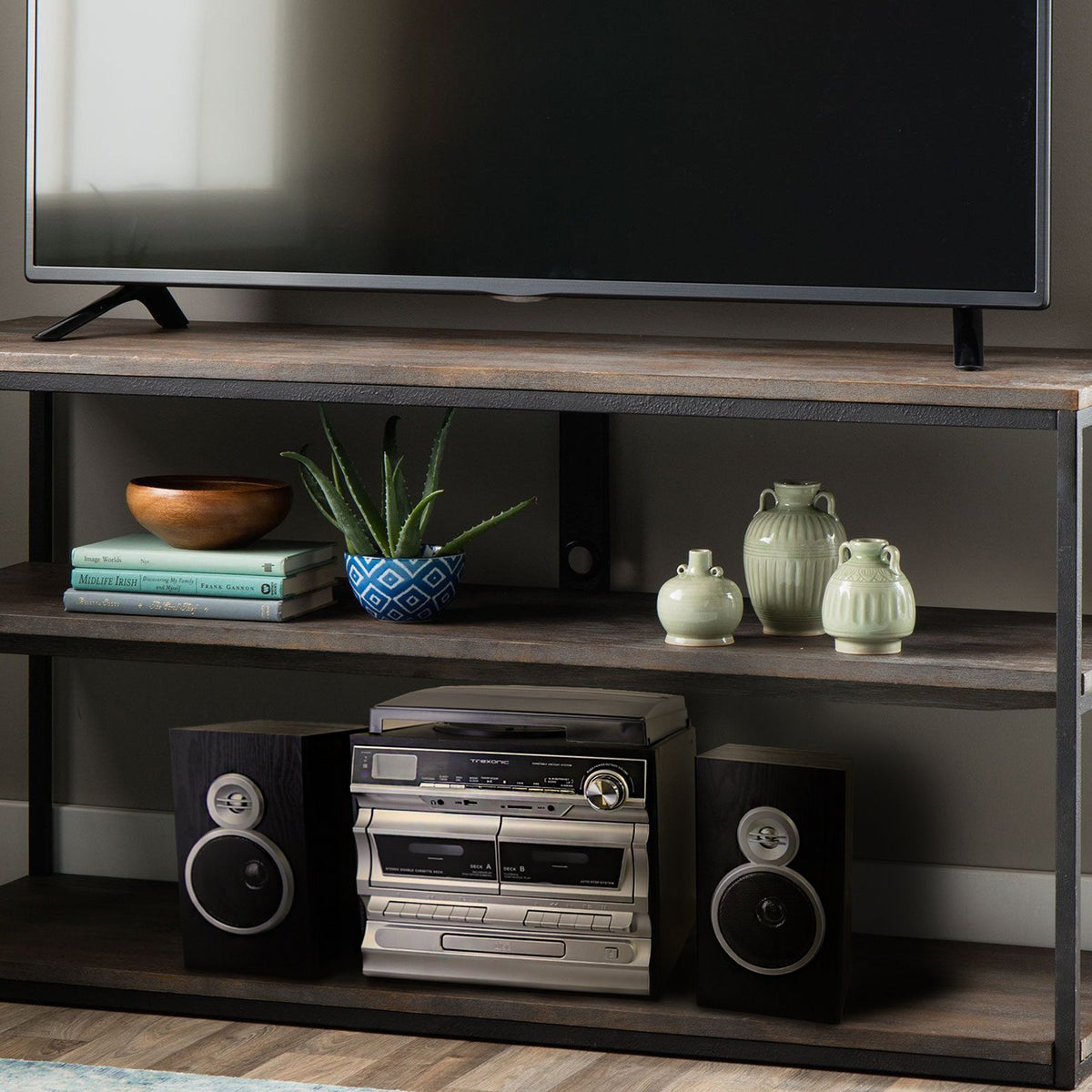 The Stunning New Turntable Home Stereo System From Trexonic Will Bring A Sense Of Musical Nostalgia To Your Home Or Office. The Trexonic 3-Speed Turntable With Cd Player, Dual Cassette Player, Wired Shelf Speakers, Fm Radio & Cd/Usb/Sd Recording Blends Seamlessly Into Your Decor Yet, Adds A Special Touch Of Sophistication To Your Entertainment Center. This Compact Yet Powerful System Will Allow You To Enjoy Your Favorite Music From A Wide Range Of Media Such As Cassettes, Vinyl Records, Cds, Digitally Recorded Music From Your Usb Flash Drive, Sd Card And Content From Your Bluetooth Enabled Devices.This Unit Features Two Wired Shelf Speakers Which Easily Connect To The Main Turntable Unit. Setting Up The System Is Simple And Intuitive. You Can Easily Convert Music From Vinyl Directly To Mp3 Format With This Sleek And Sophisticated Home Stereo Turntable. In Addition You Ll Have Direct Usb And Sd Encoding From The Turntable, Cd, Cassette, Aux Input, And Fm Radio. This System Is Sure To Please Those Of Us Looking For The Comfort Of Warm Memories, As Well As A New Generation Seeking To Connect To A Musical History That Leaps Of Classic Vinyl Records. * Record From Vinyl, Radio, And Cassette To Mp3, Sd And Usb>* Record From Aux To Usb/Sd* Usb/Sd Slot For Mp3 Playback>* 33/45/78 Rpm Select-Able Turntable* Dual Cassette Player: Play, Pause, Fast-Forward, Rewind, Stop, Record* Record To Cassette From: Turntable, Cd, Cassette, Aux In, Usb Or Sd* Easily Convert Your Favorite Vinyl Directly To Mp3 Format * Direct Usb And Sd Encoding From Turntable, Cd, Cassette, Aux Input, And Fm Radio* Easily Connects To Most Bluetooth Enabled Devices>* 3.5Mm Aux Input>* Fm Radio* Lcd With Blue Backlight * Includes Remote Controls>* Rca Line-Out * 3.5Mm Headphone Jack* 4 Watts Per Speaker