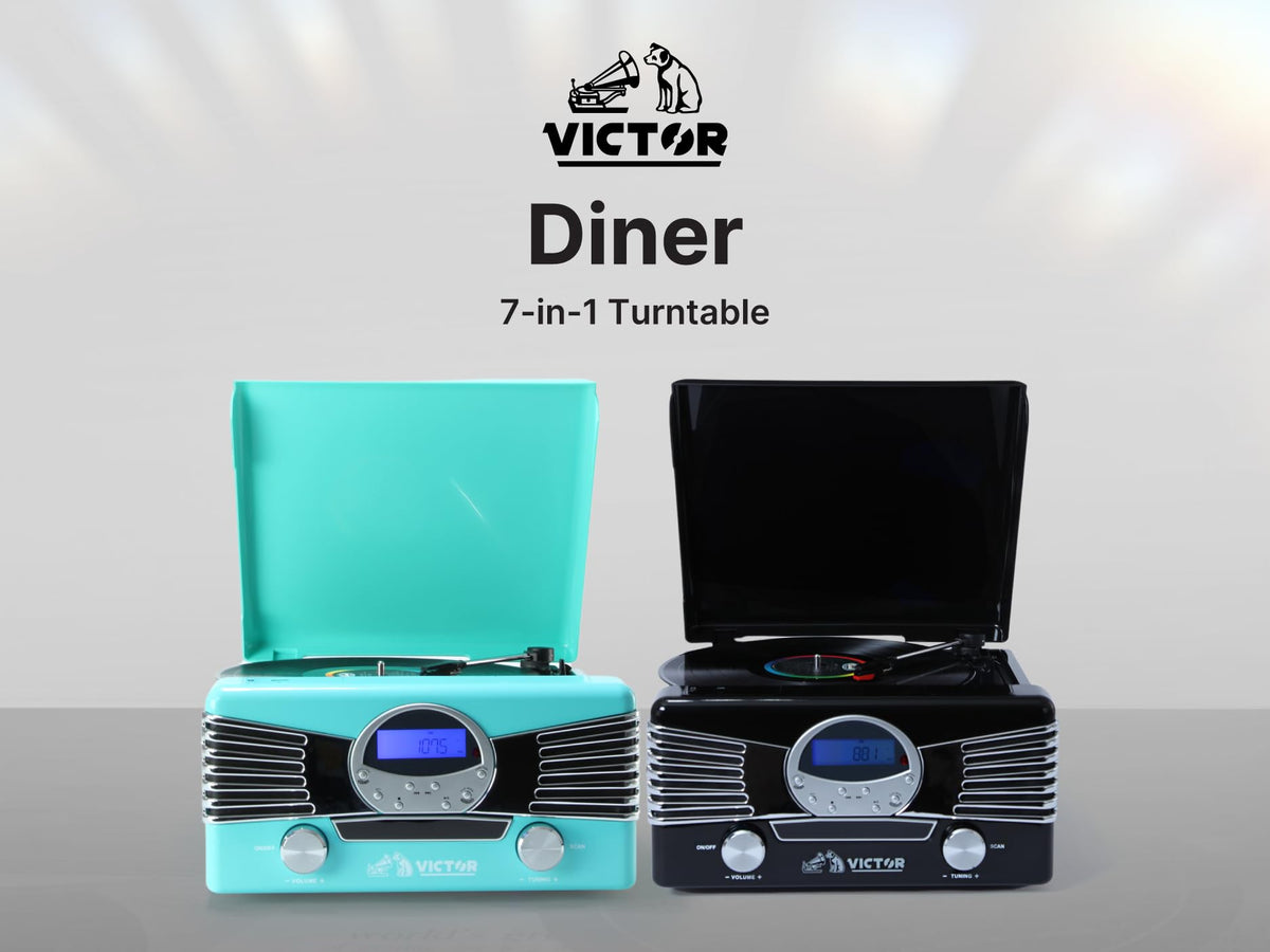 Victor Diner 7-In-1 Music Center Is Loaded With Modern Features Within A Great 1950As Diner Design. The Built In 3-Speed Turntable, Cd & Amfm Radio Are Ready To Play All Your Favorite Songs The Dual Bluetooth Feature Allows Streaming Of Your Vinyl Records To An External Bluetooth Speaker Or Plays Music From Your Smart Device Through The Diners Built In Speakers. The 3.5Mm Aux Input Allows For Even More Additional Playback Options