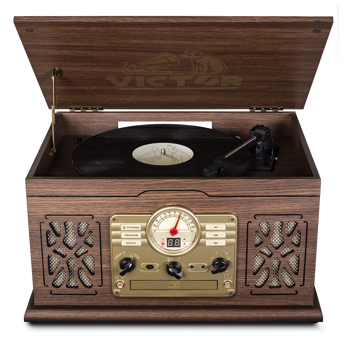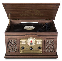 Victor State 7-In-1 Espresso Wood Music Center Is Loaded With Features At An Attractive Price Point. The 3 Speed Turntable Stands Ready To Play Your Favorite Vinyl. The Dual Bluetooth Model Allows Streaming Of Your Music To An External Speaker. Includes A Cassette & Cd Player, Built In Speakers, And Fm Radio.