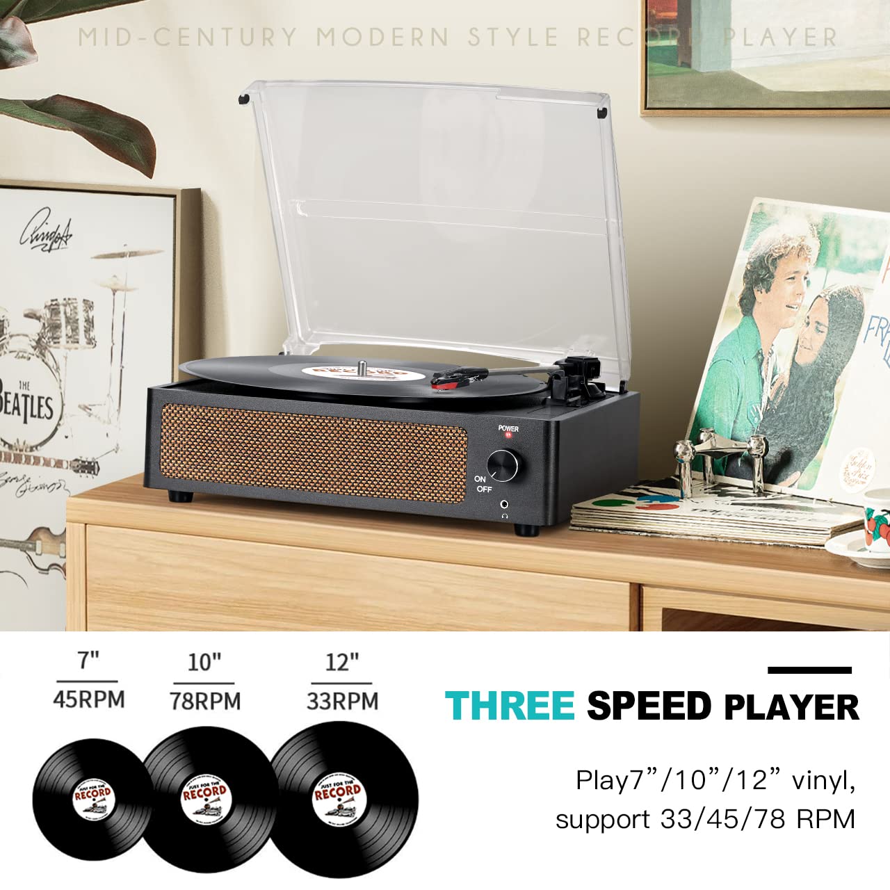 3-Speed Belt Drive Turntable The Diamond-Tipped Stylus Plays All Of 33 1/3, 45, And 79 Rpms Records. Auto-Stop Setting Makes It Possible To Stop Automatically When It Reaches The End Of The Record. Supporting Universal 3-Size Of 7/10/12 Inches Or Any Other Size Record. If Needed, The 45Rpm Adapter Is Included. Wireless Bt Connection Streaming Built-In Bt Receiver Lets You Wirelessly Connect To Your Mobile Phone Through Sensitive And Fast Bt Pairing And Play Any Digital Music You Want. So You Dont Need To Worry Either If You Do Not Have Enough Vinyl Records. Built-In Stereo Turntable With Outstanding Sound The Built-In Speakers Will Work For Most People, So If You'Re A Record Player Starter, This Would Be A Good Choice. You Don'T Have To Worry About Not Having Extra Speakers In Your Home. Vintage Audio Turntable Record Player The Vinyl Turntable With Vintage Wood Appearance Is Equipped With A Protective Dust Cover.The Full Covered Protective Dust Cover Would Not Affect The Normal Playback When You Close It. Great Idea It Creates A Warm Atmosphere When Family Gatherings. When You Are Alone, It Can Help You Relax. Even If You Don'T Use It, It Can Be One Of The Home'S Premium Decorations. It Also Allows The Recipient To Feel Your Heart. Rca Line Output And Aux-In Your Turntable Record Players For Vinyl With Speakers Include Both Phono And Line Outputs That Allow Playing With Or Without A Phono Equalizer. It Also Can Play Other Devices Music By Wireless Bluetooth Or Using The Aux-In Port. For Better Or Louder Sound, Connect The External Speaker Via An Rca Cable.