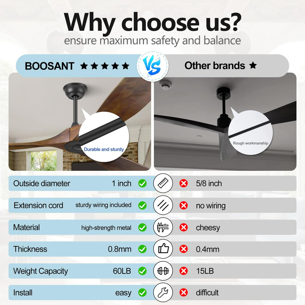 Q: What materials are used in the construction of the BOOSANT downrod?A: The BOOSANT downrod is made from durable alloy steel, providing a robust and long-lasting solution for extending your ceiling fan's reach.