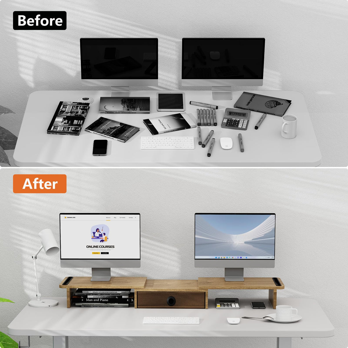 Ergofocus Dual Monitor Stand Riser With Drawer Adjustable Length And Angle, Monitor Stand Riser For 2 Monitors, Desktop Organize