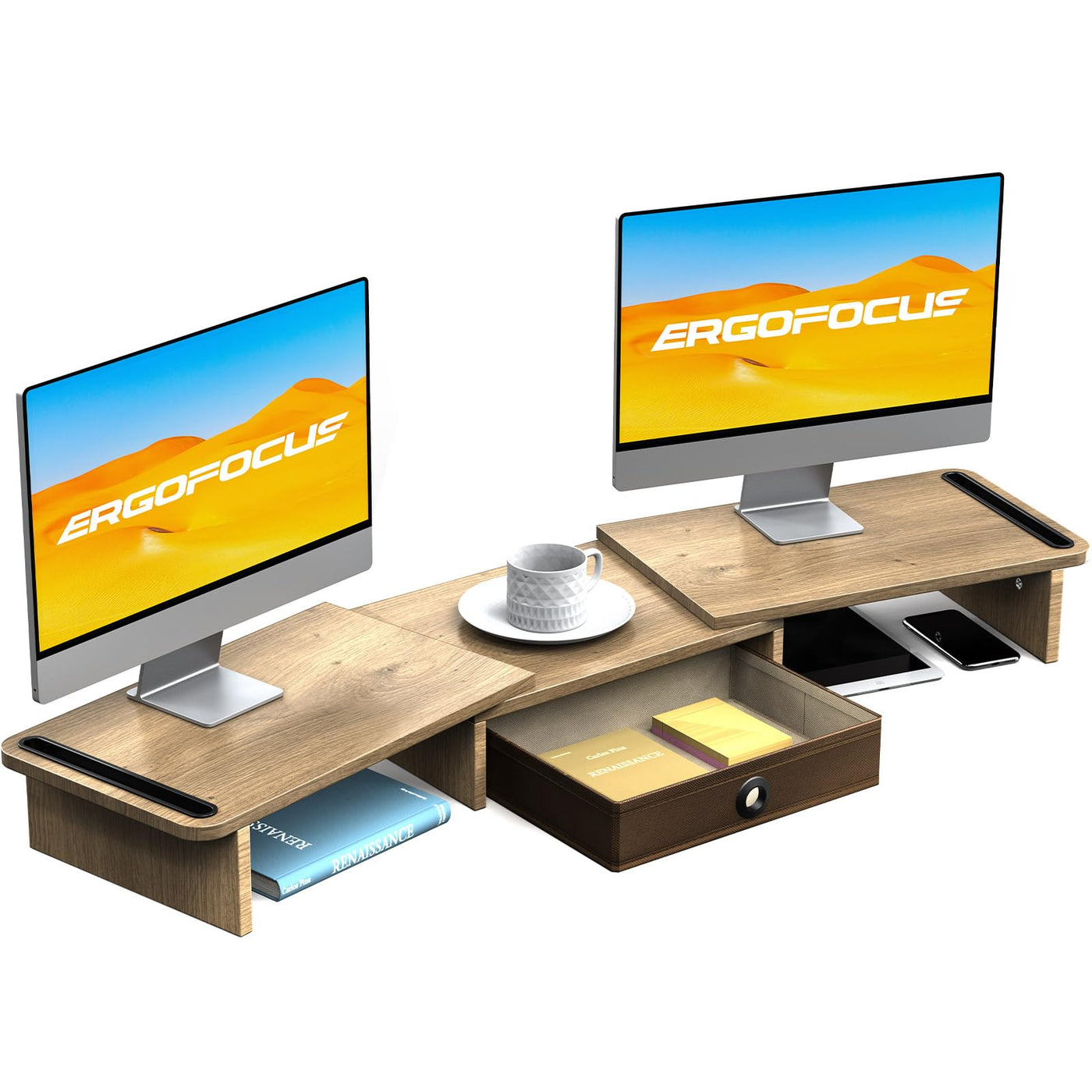 Ergofocus Dual Monitor Stand Riser With Drawer-Adjustable Length And Angle, Monitor Stand Riser For 2 Monitors, Desktop Organizer Stand For Computer/Laptop/Pc/Printer (Oak)
